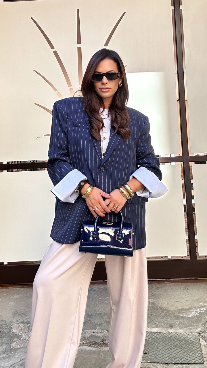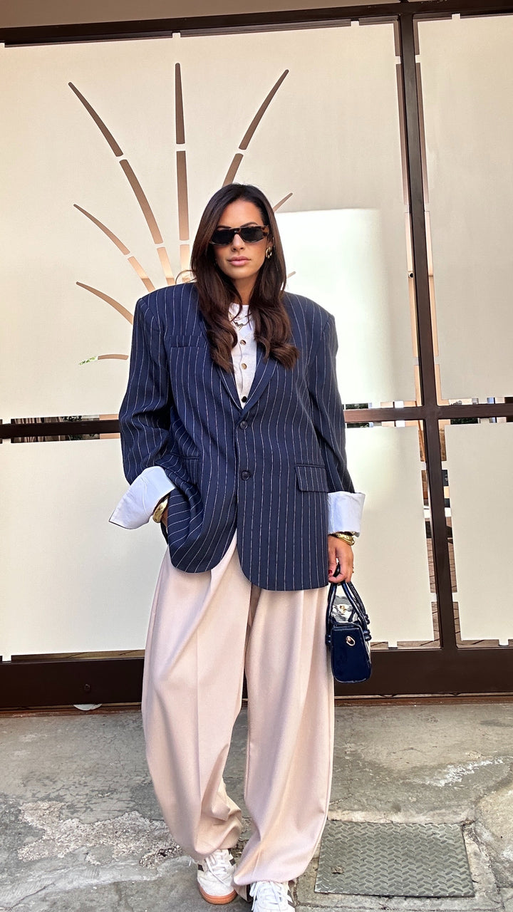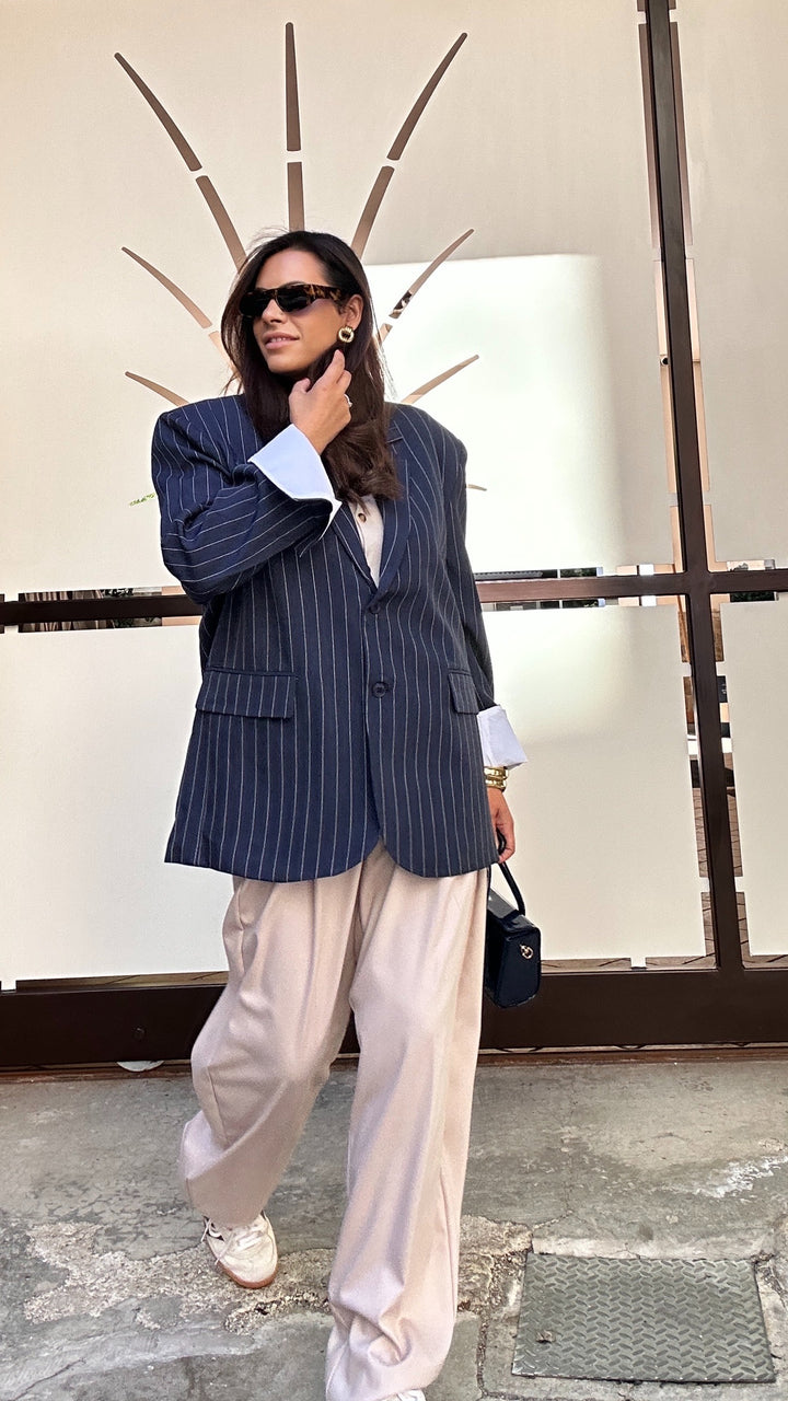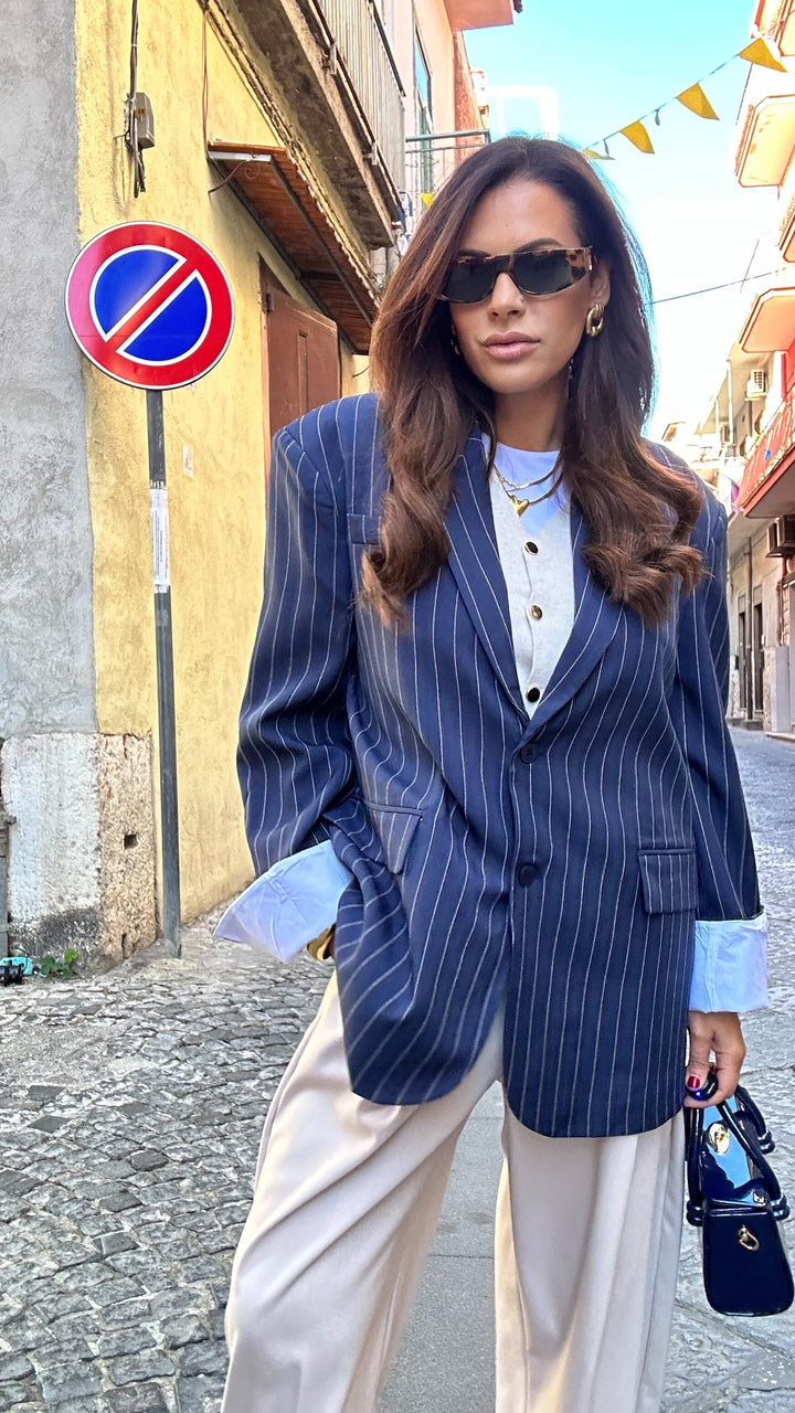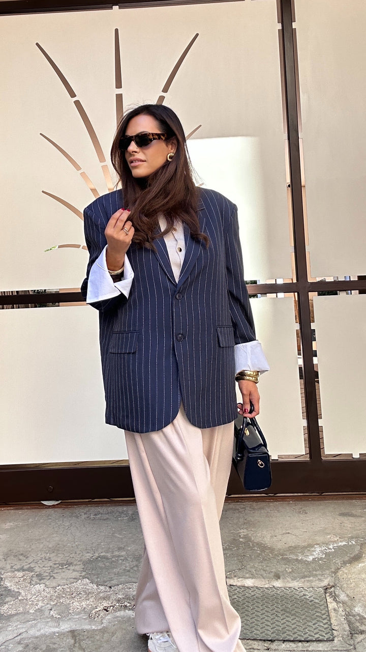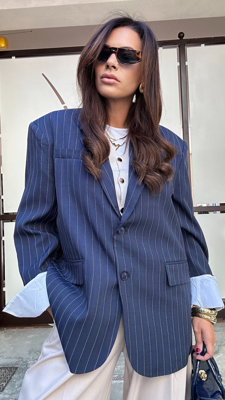 Giacca modello over fondo blu e gessato blu spalline strutturate all'interno bottoni tonondu tono sul davanti e risvolto largo suoi polsi in contrasto di colore bianco tasche finte sul davanti