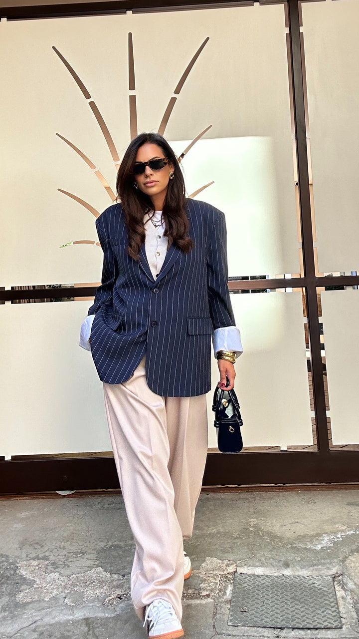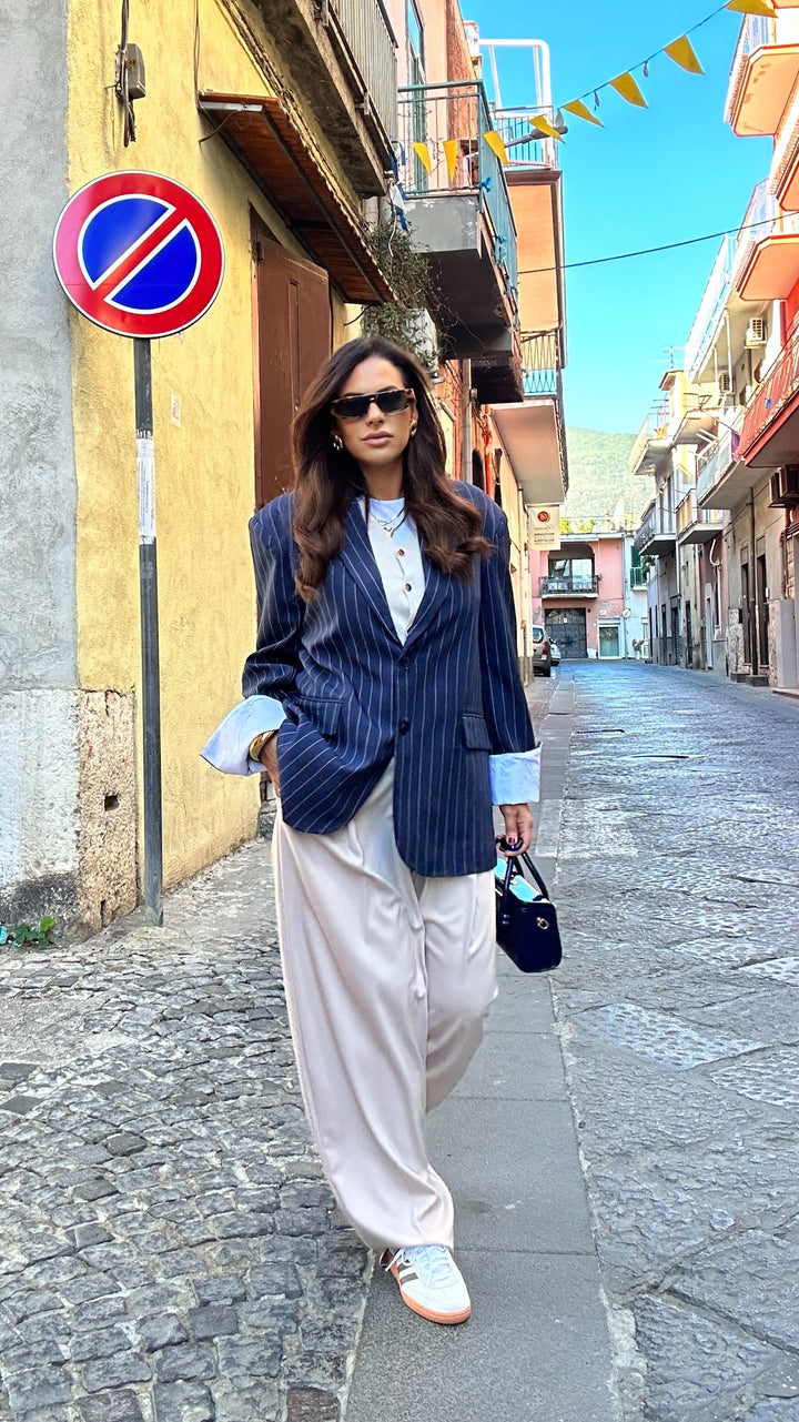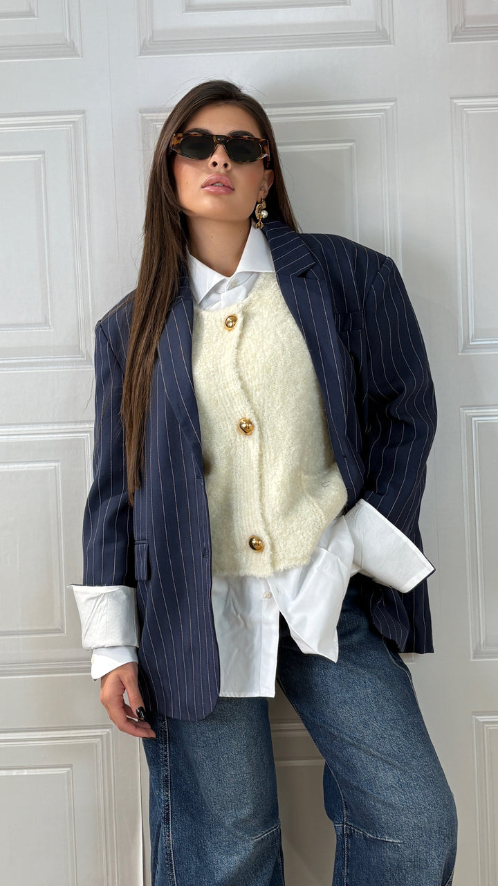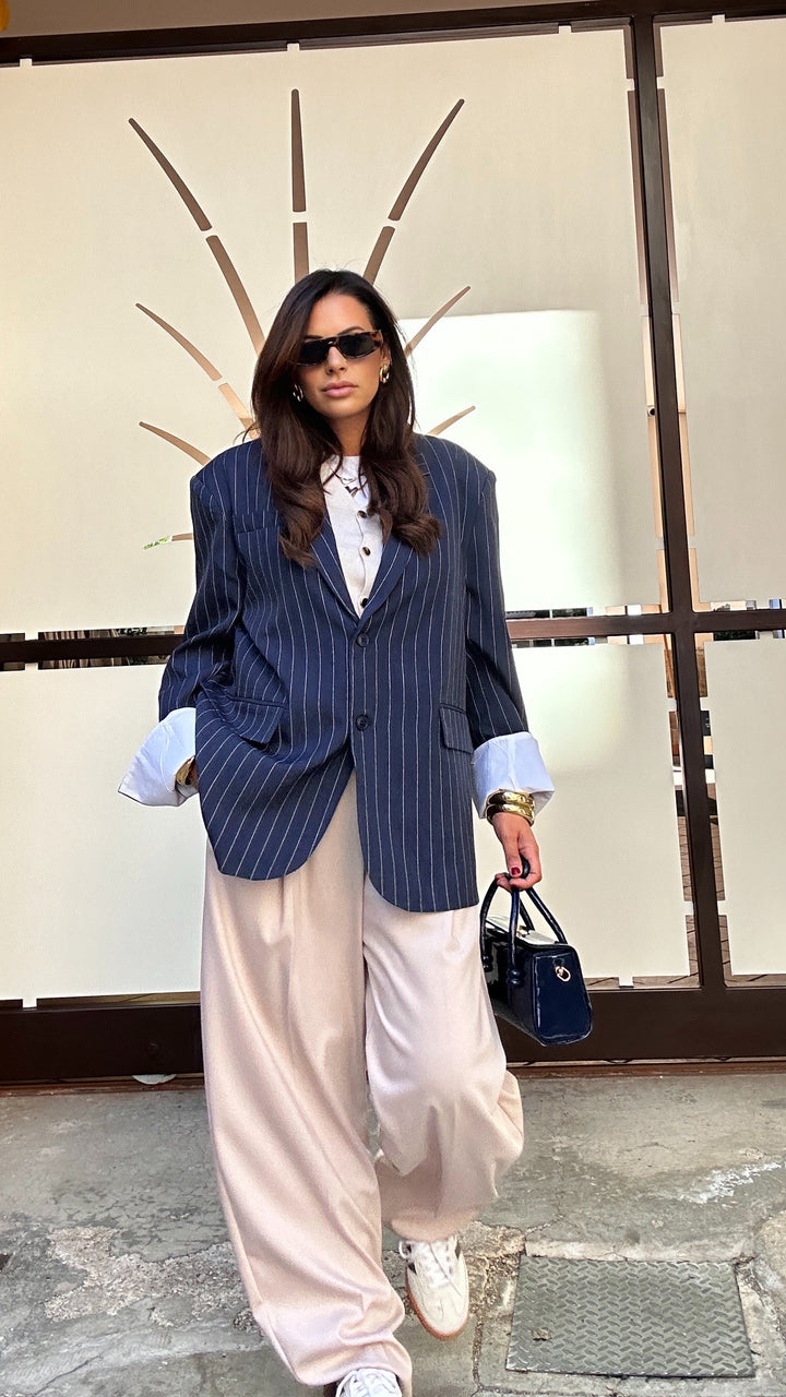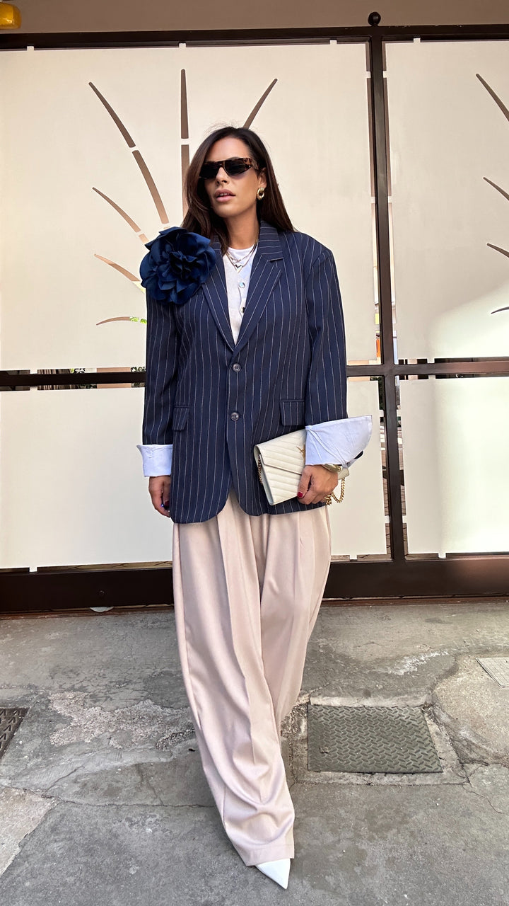 Giacca modello over fondo blu e gessato blu spalline strutturate all'interno bottoni tonondu tono sul davanti e risvolto largo suoi polsi in contrasto di colore bianco tasche finte sul davanti