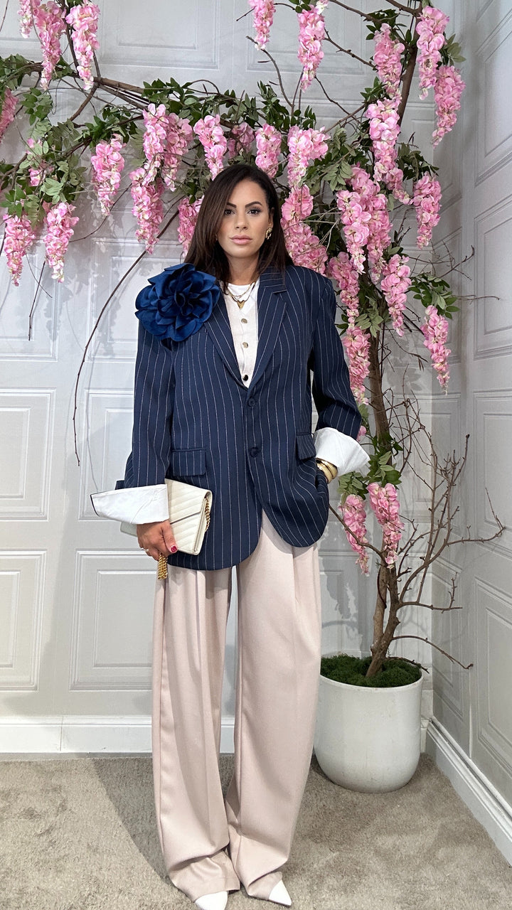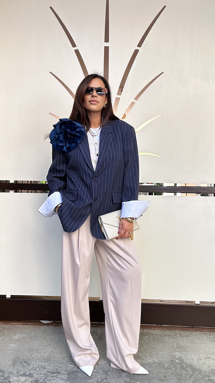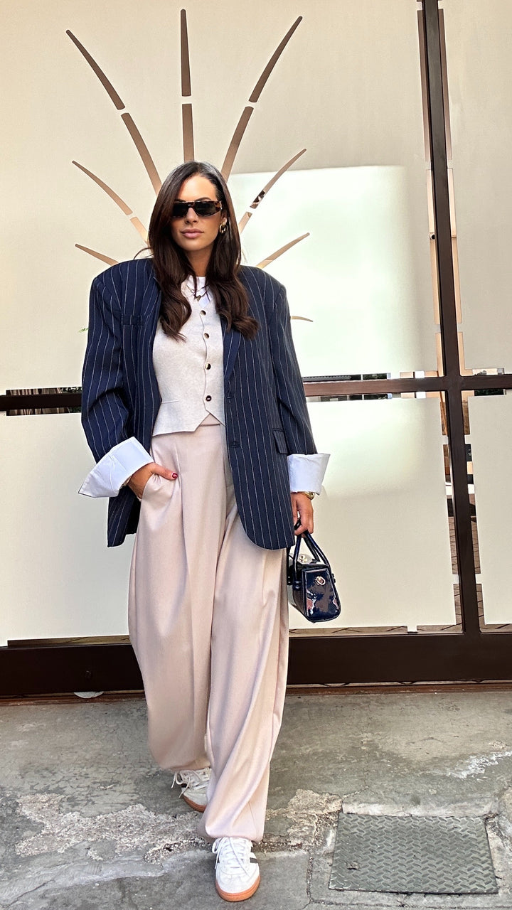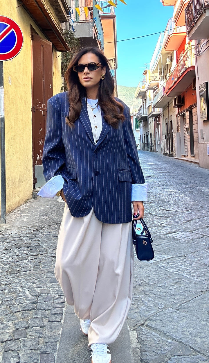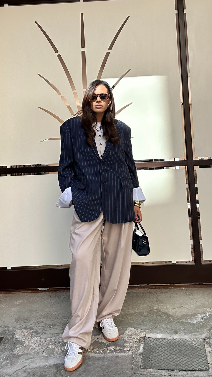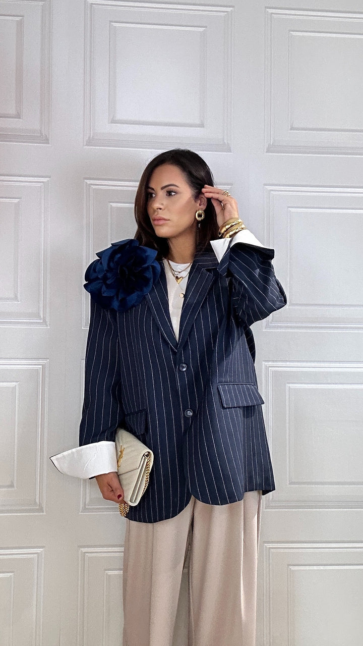 Giacca modello over fondo blu e gessato blu spalline strutturate all'interno bottoni tonondu tono sul davanti e risvolto largo suoi polsi in contrasto di colore bianco tasche finte sul davanti