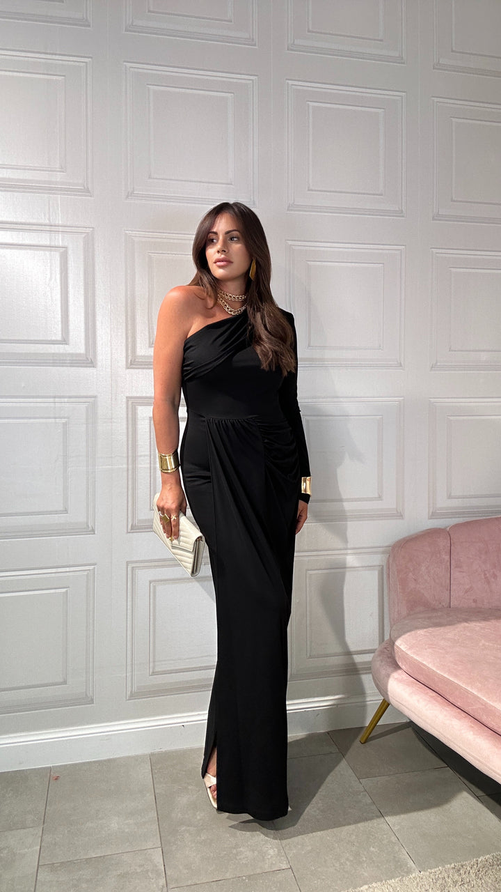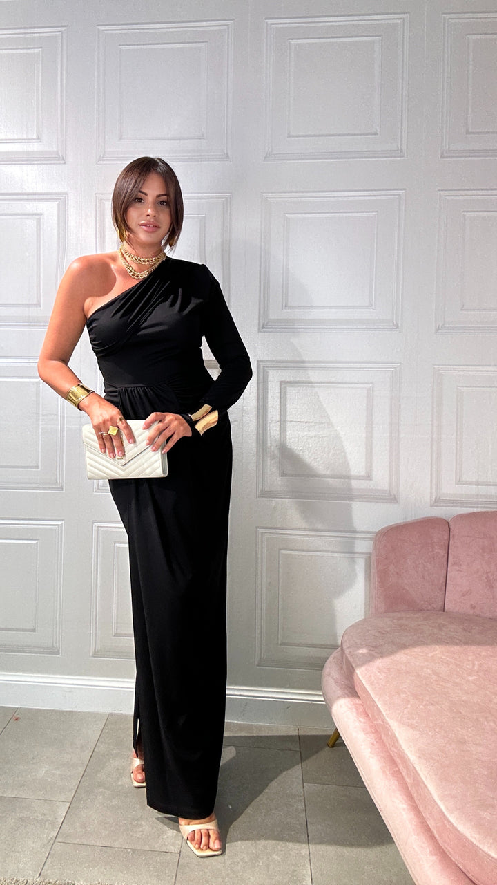 Abito monospalla, Made in Italy 60% viscosa, tessuto non sintetico, monospalla, con drappeggio su un seno, fasciato sotto al seno e maxi piegone con spacco sul davanti. Leggermente elastico.