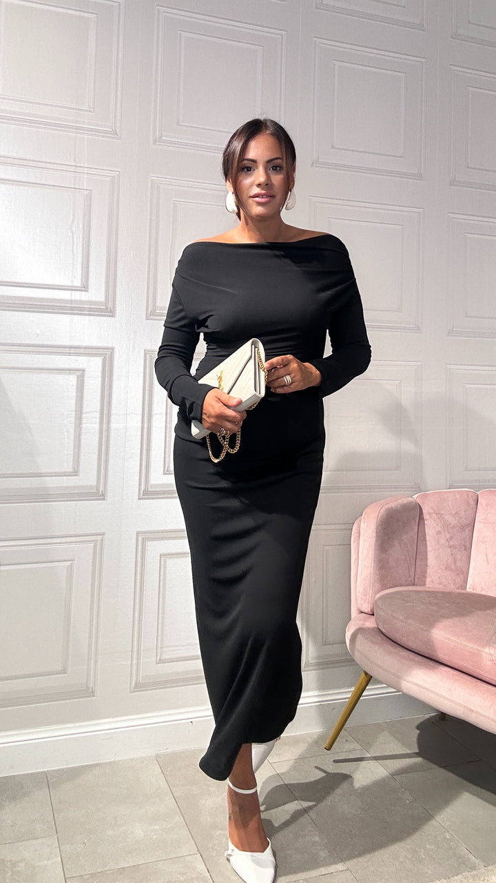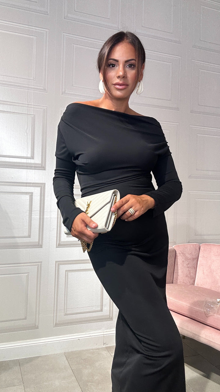 Abito Made in Italy in llycra con scollatura asimmetrica, leggermente drappeggiato sulla pancia. Elastico