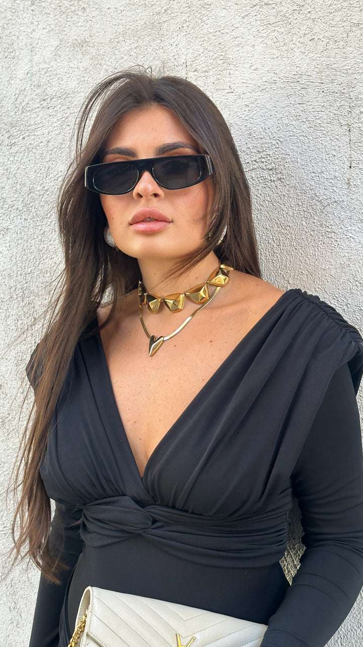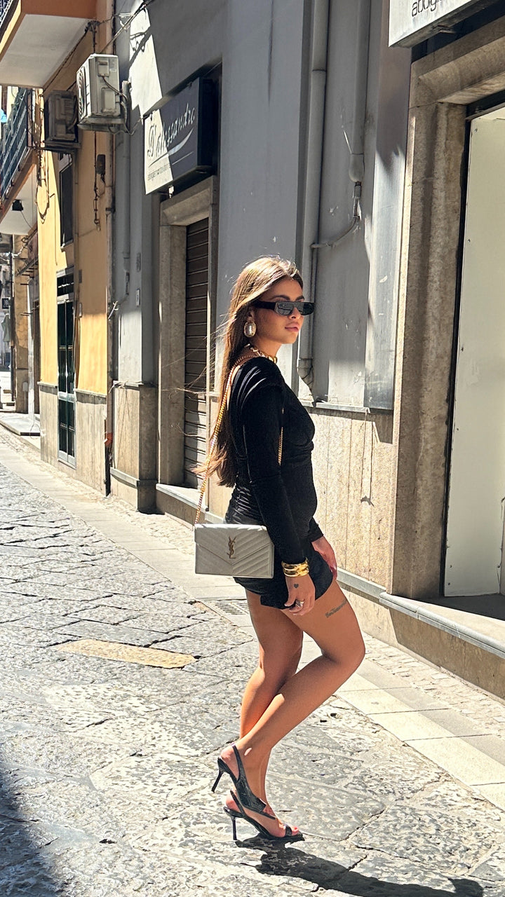 Abito mini in lycra con scollatura a punta con drappeggio sulle spalle. Veste fino alla taglia 44