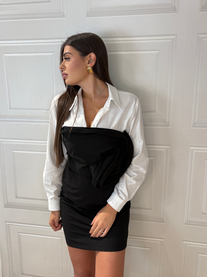 Abito di lumina a tubino corto con scolllo fascia asimmetrico , applicazione stesso con il tessuto a forma di fiore