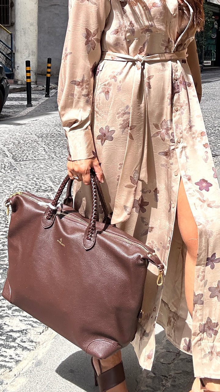 I manici sono dotati di una lavorazione intrecciata, che non solo aggiunge un tocco di stile, ma rende anche la presa più comoda. La borsa è di forma ampia, con un profilo morbido che la rende pratica per l'uso quotidiano.