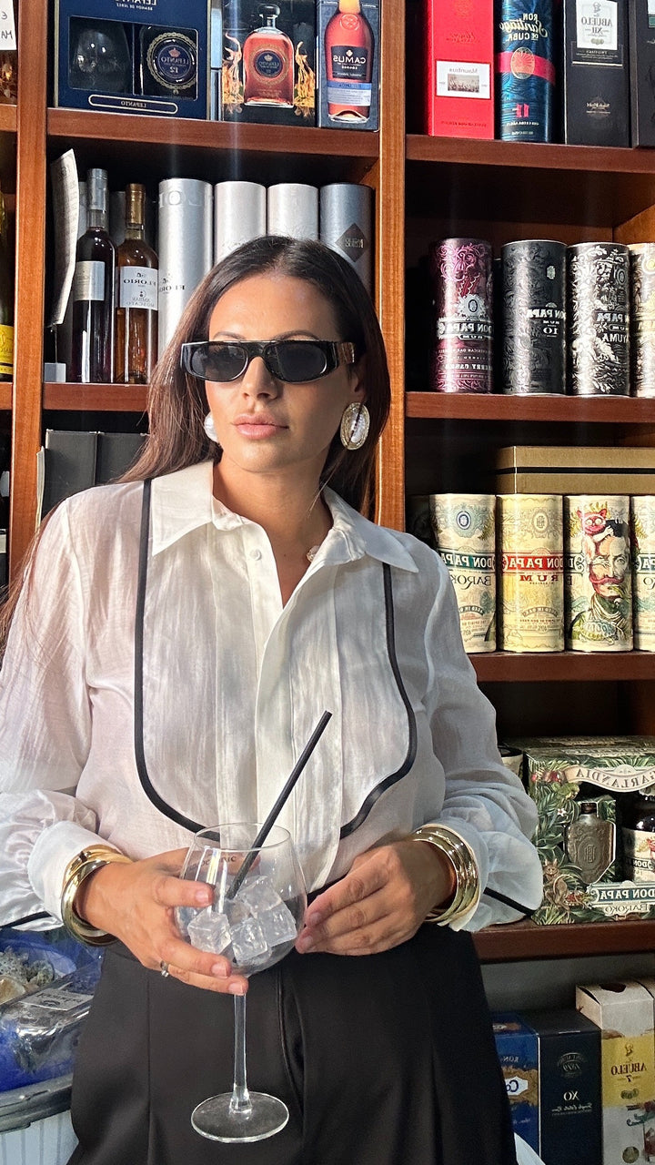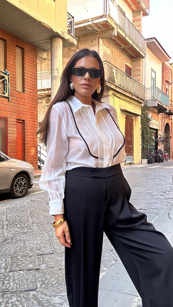 Camicia Made in Italy dal tessuto leggermente trasparente con bordo nero. Vestibilita regolare