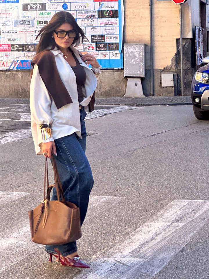 Camicia 80% poliestere 20% cotone. Vestibilita over size  porta le tasche sul davanti e un finto Maglioncino sulle spalle nella variante del mattone