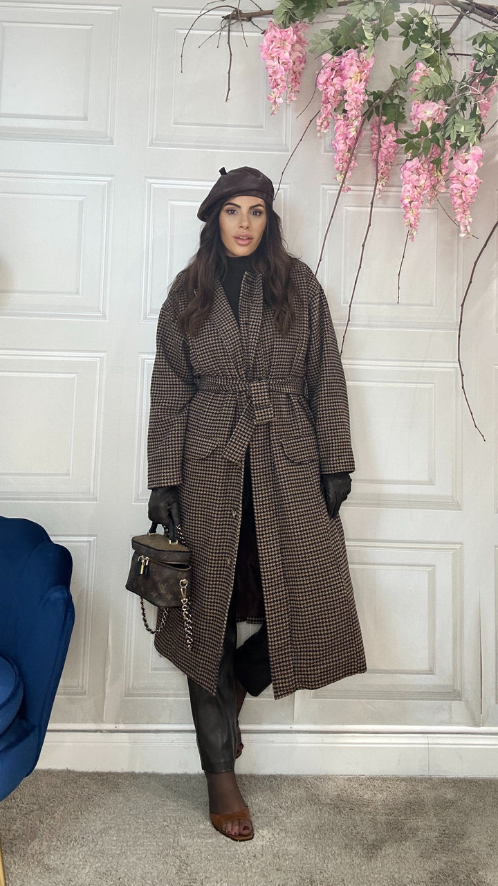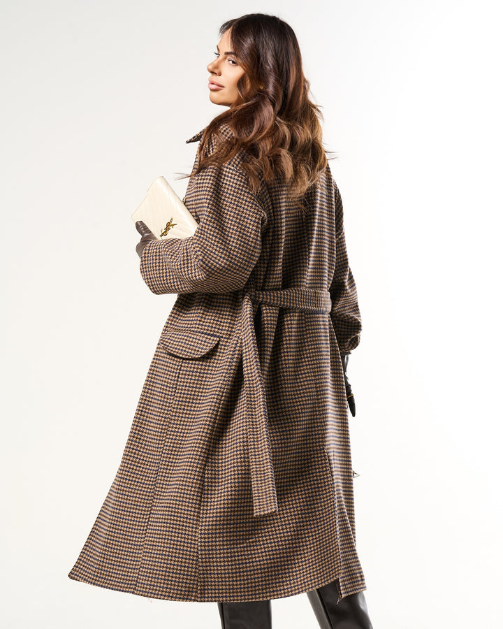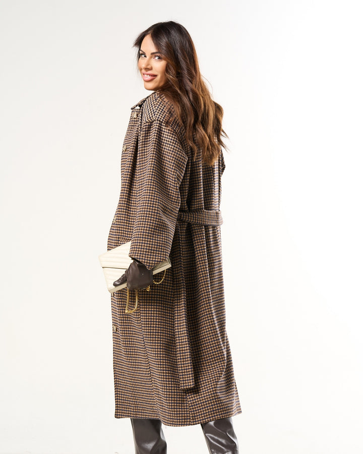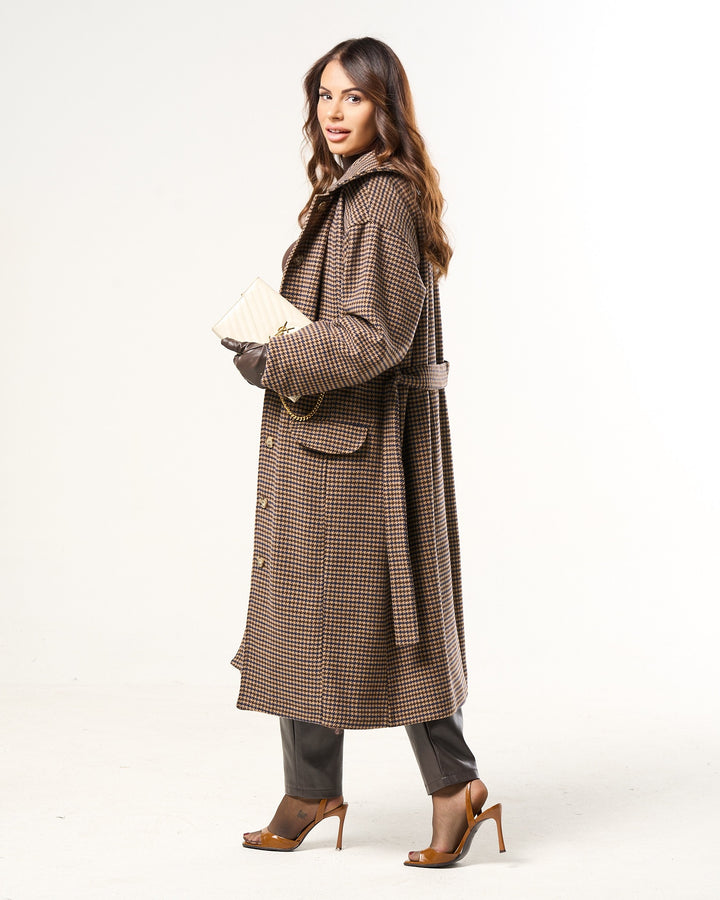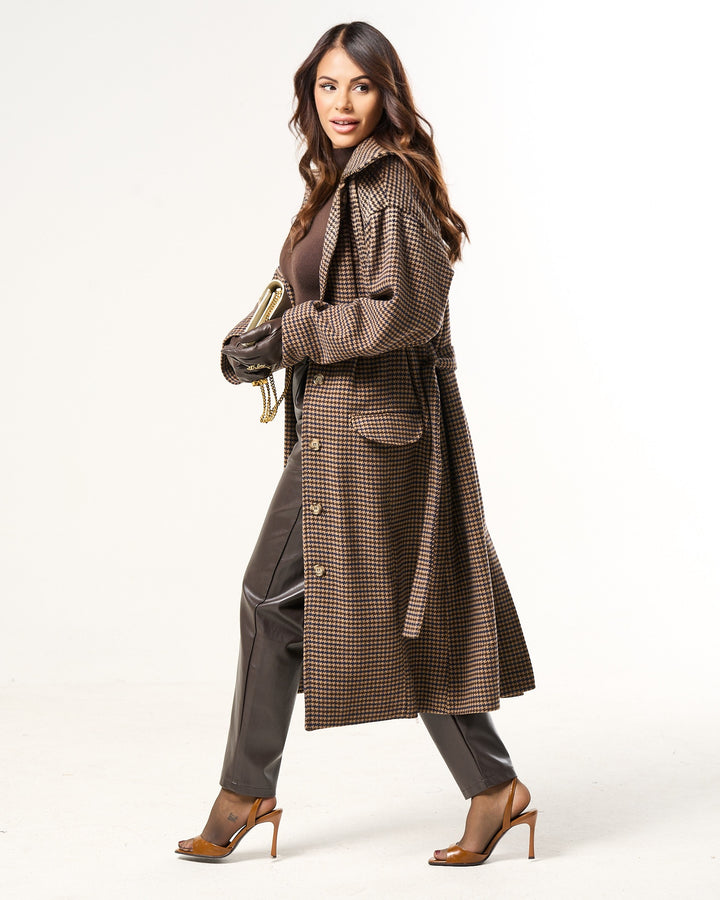 Cappotto produzione italiana in poliestere e viscosa,modello lungo e avvitato con colletto a camicia e cintura in vita con fibbia in acciaio ,tasconi veri sui fianchi ,la chiusura e a bottoni a scomparsa tono su tono vestibilità regolare