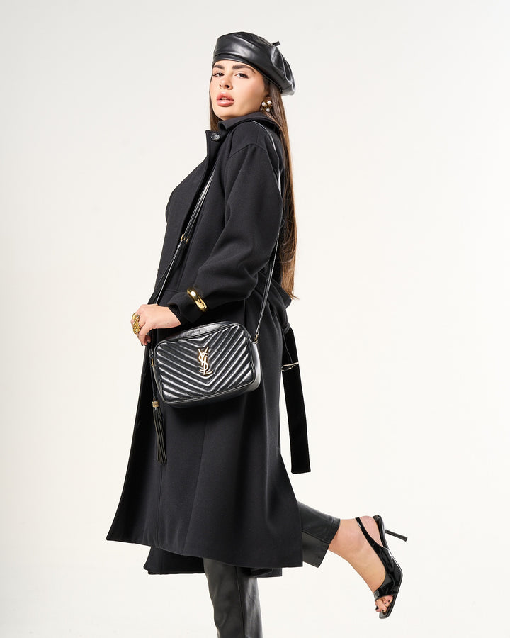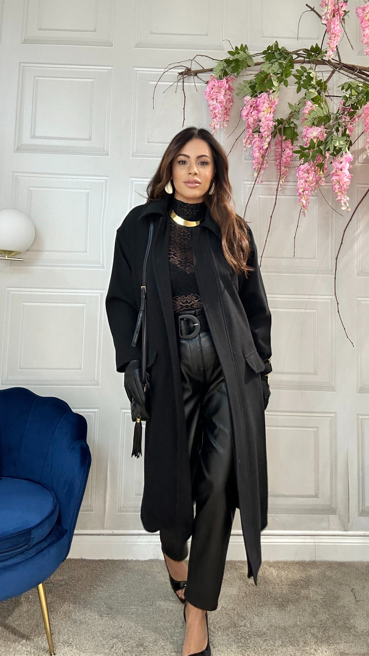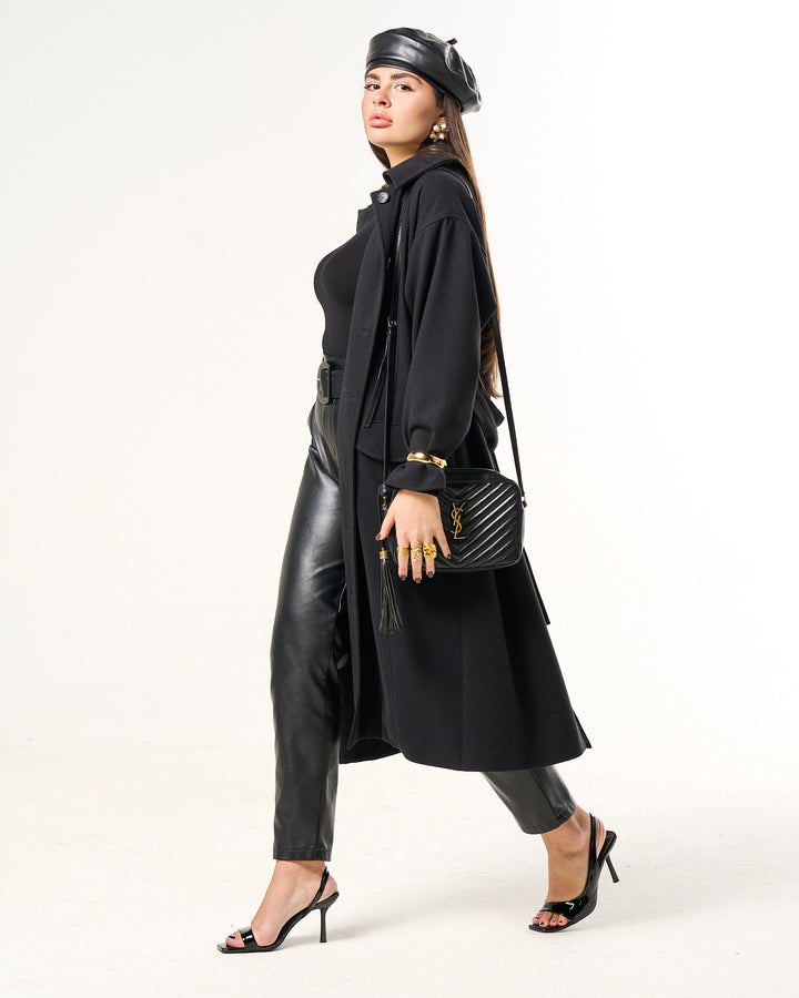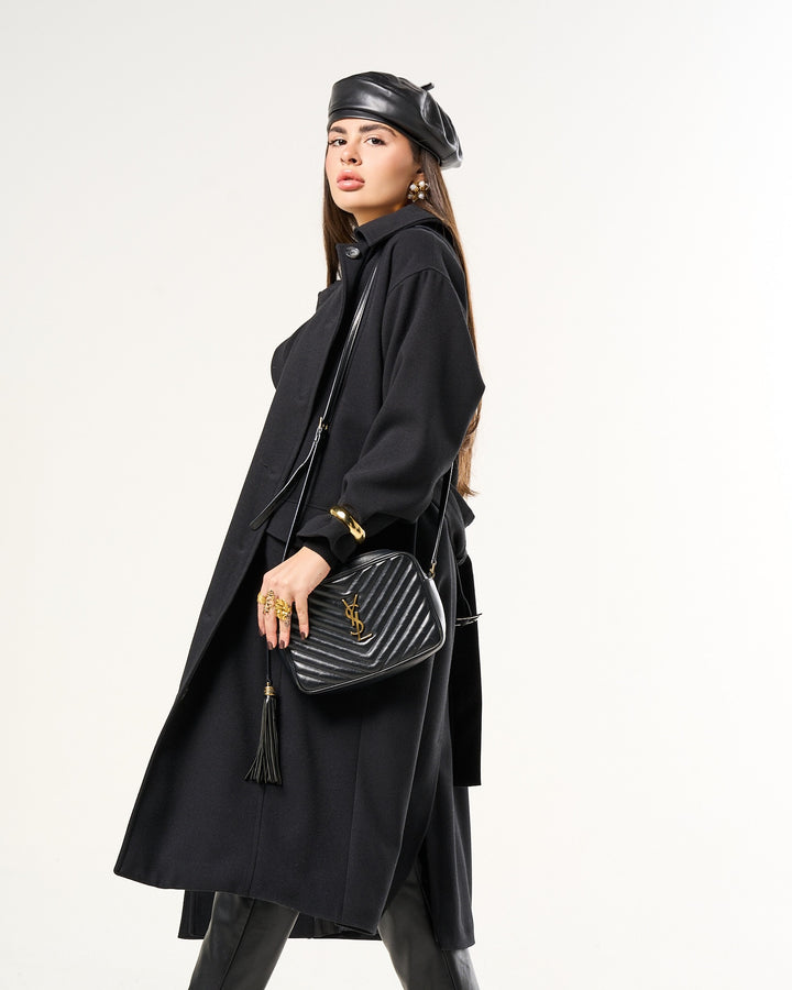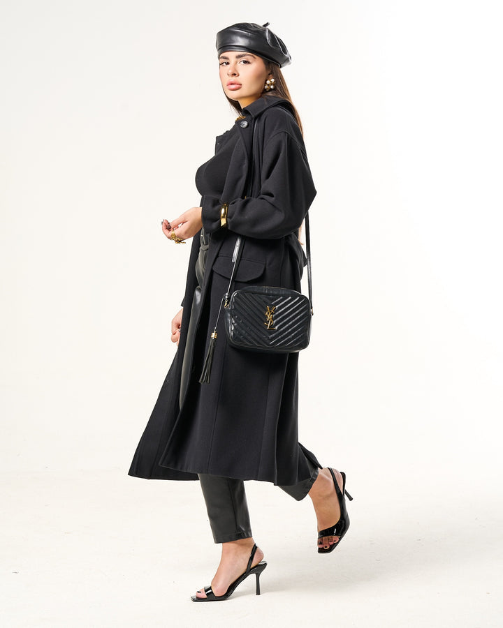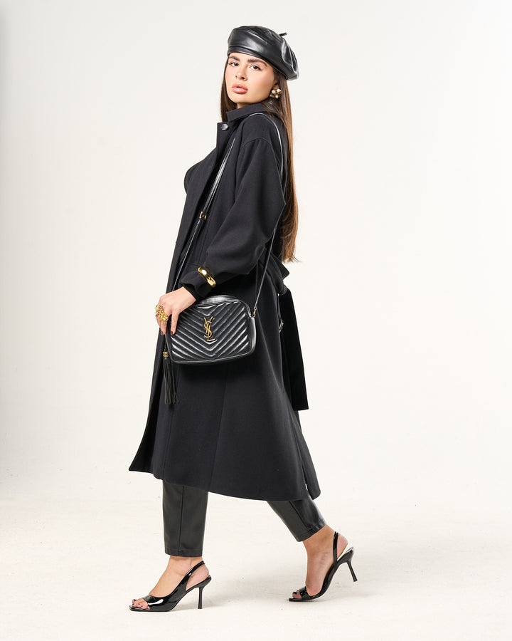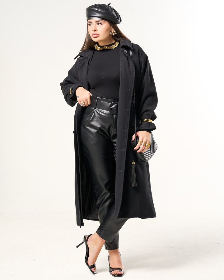 Cappotto produzione italiana in poliestere e viscosa,modello lungo e avvitato con colletto a camicia e cintura in vita con fibbia in acciaio ,tasconi veri sui fianchi ,la chiusura e a bottoni a scomparsa tono su tono vestibilità regolare