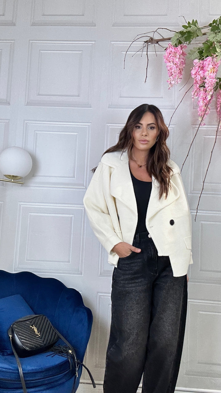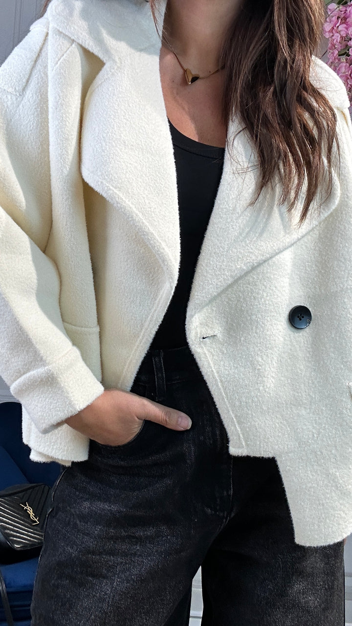 Cardigan in lana rasata con doppio bottone nero. Vestibilita over. Premium quality. Taglia unica veste fino alla 48