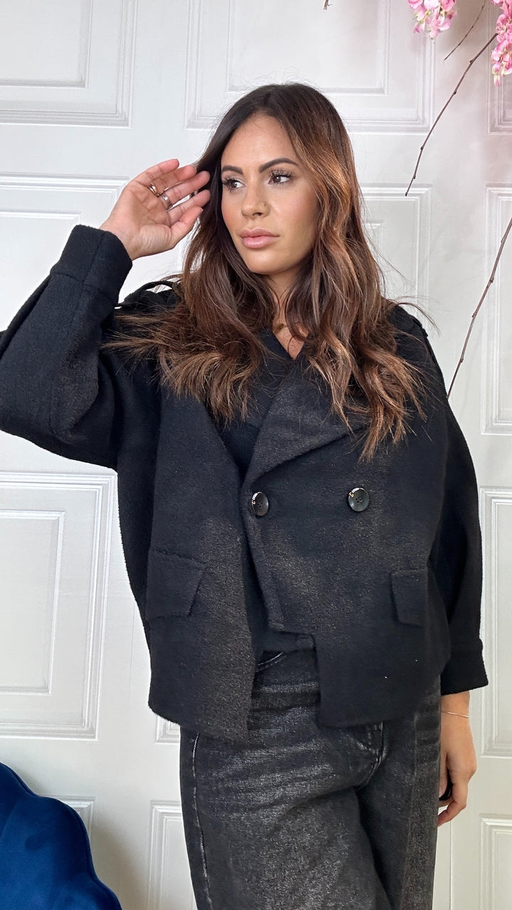 Cardigan in lana rasata con doppio bottone nero. Vestibilita over. Premium quality. Taglia unica veste fino alla 48