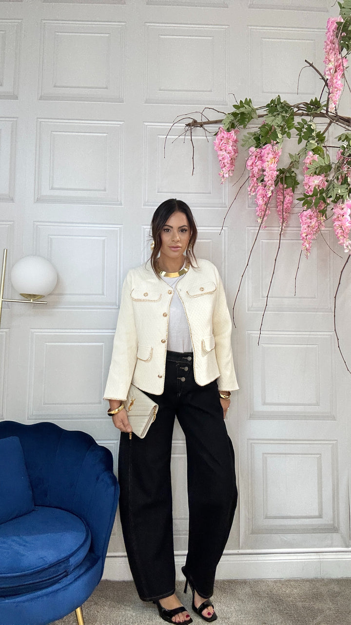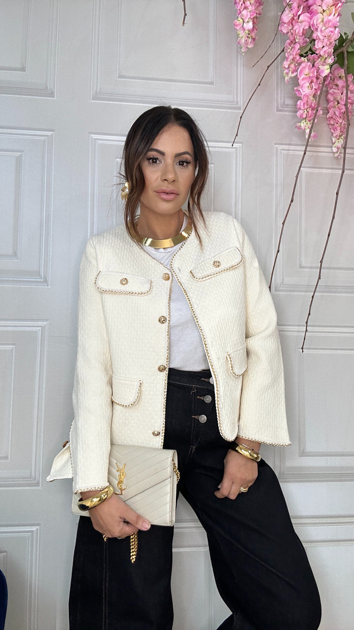 Giacca/cardigan in lana a coste con profilo oro e bottoni oro. Veste fino alla 46