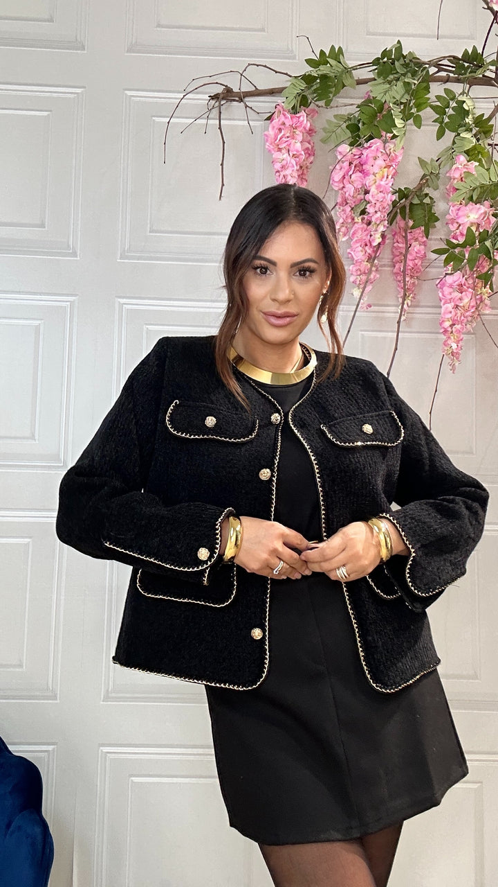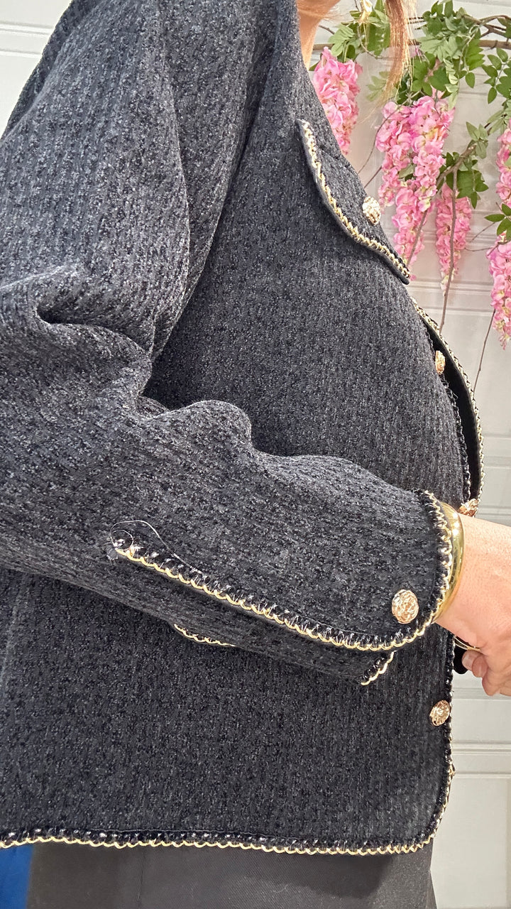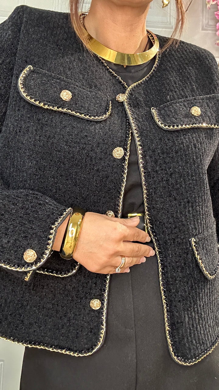 Giacca/cardigan in lana a coste con profilo oro e bottoni oro. Veste fino alla 46