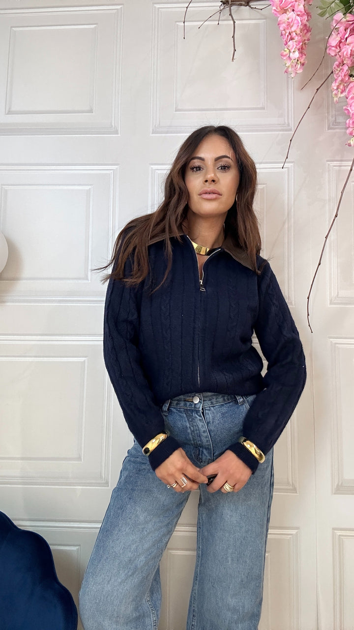 Cardigan in lana con trama intrecciata. Porta la cerniera sul davanti con il doppio cursore è il colletto in simil pelle. È una taglia unica che
