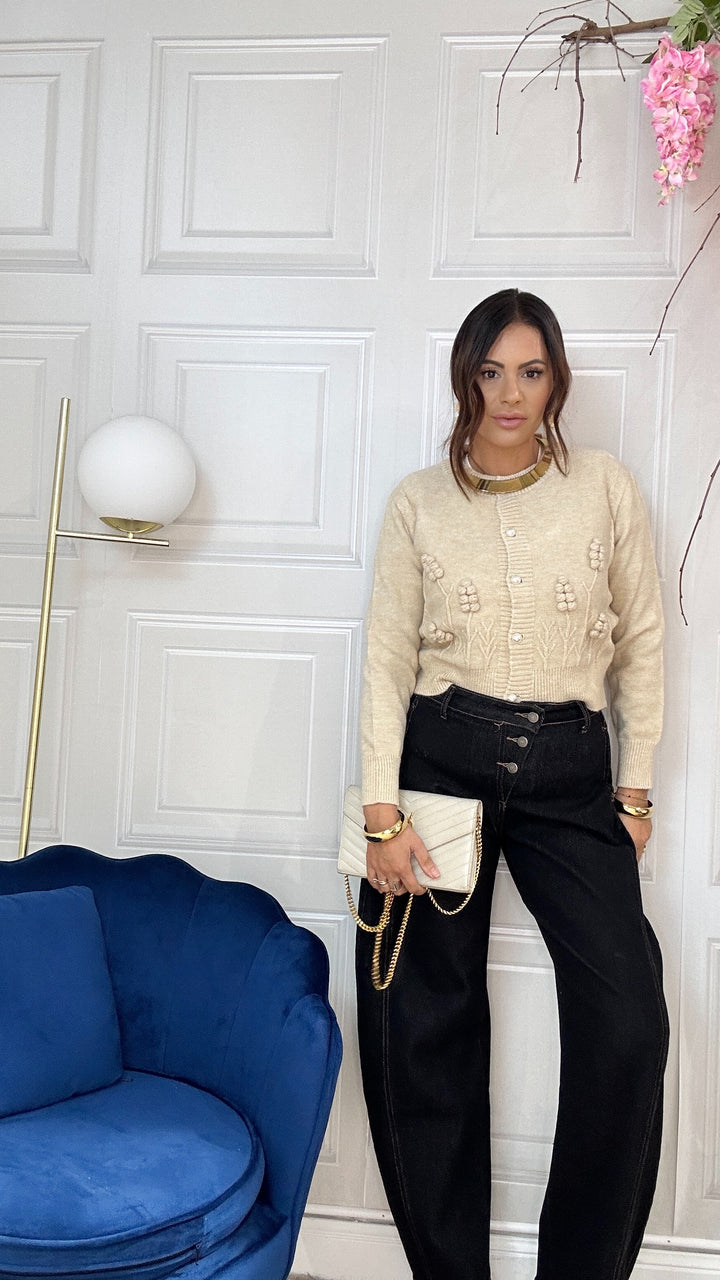 Cardigan in lana rasata con bottoni di perla e dettaglio di disegno in rilievo. Taglia unica veste fino alla 46