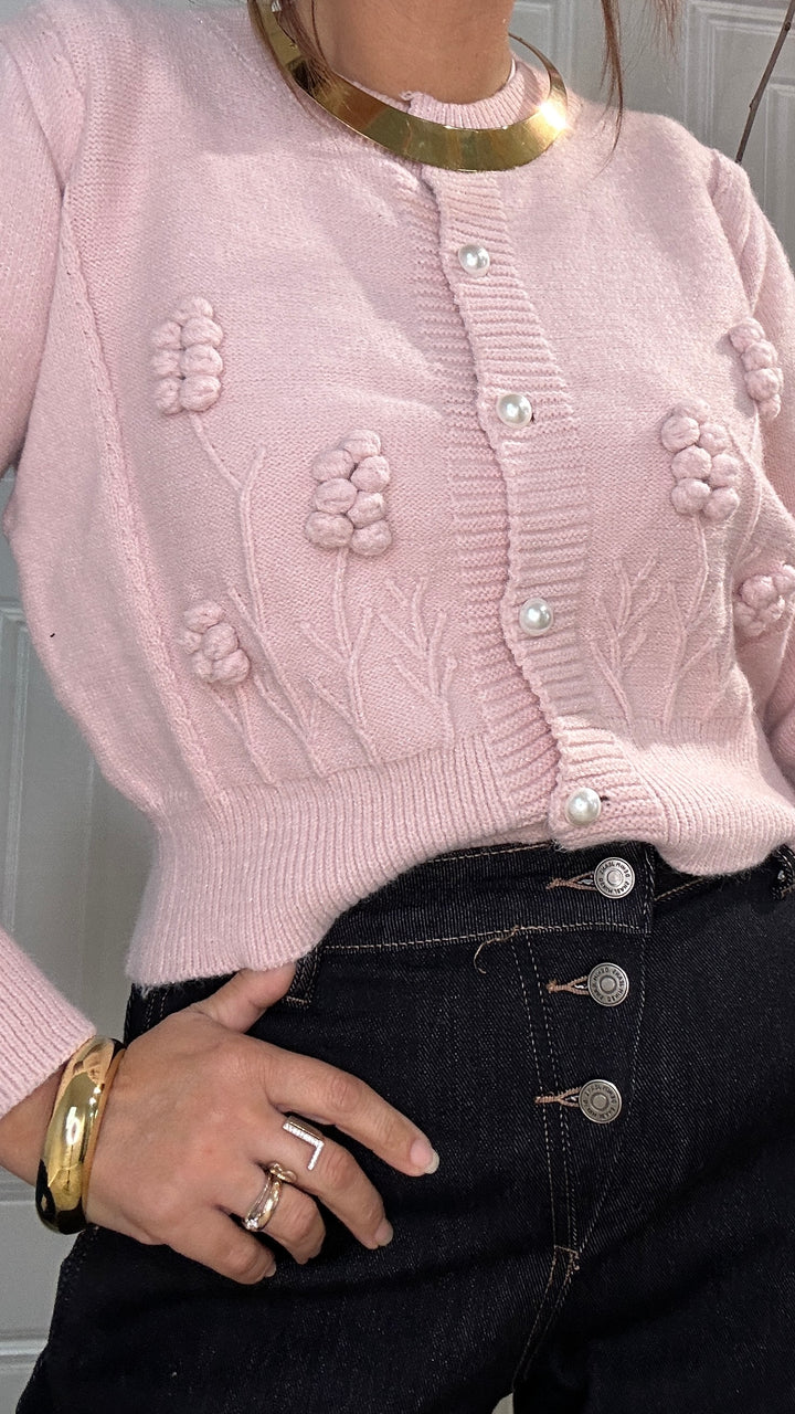 Cardigan in lana rasata con bottoni di perla e dettaglio di disegno in rilievo. Taglia unica veste fino alla 46