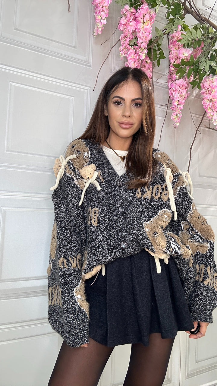 Cardigan 100% viscosa scollo a punta con bottoni sul davanti lunghezza media con applicazioni Teddy,fiocchi e PON PON sul davanti