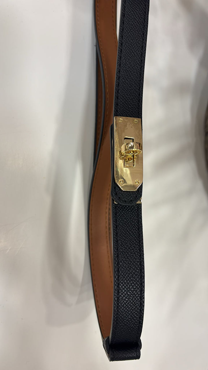 Cinturino in simil pelle con dettaglio oro. La chiusura è sul davanti. Veste fino alla 46