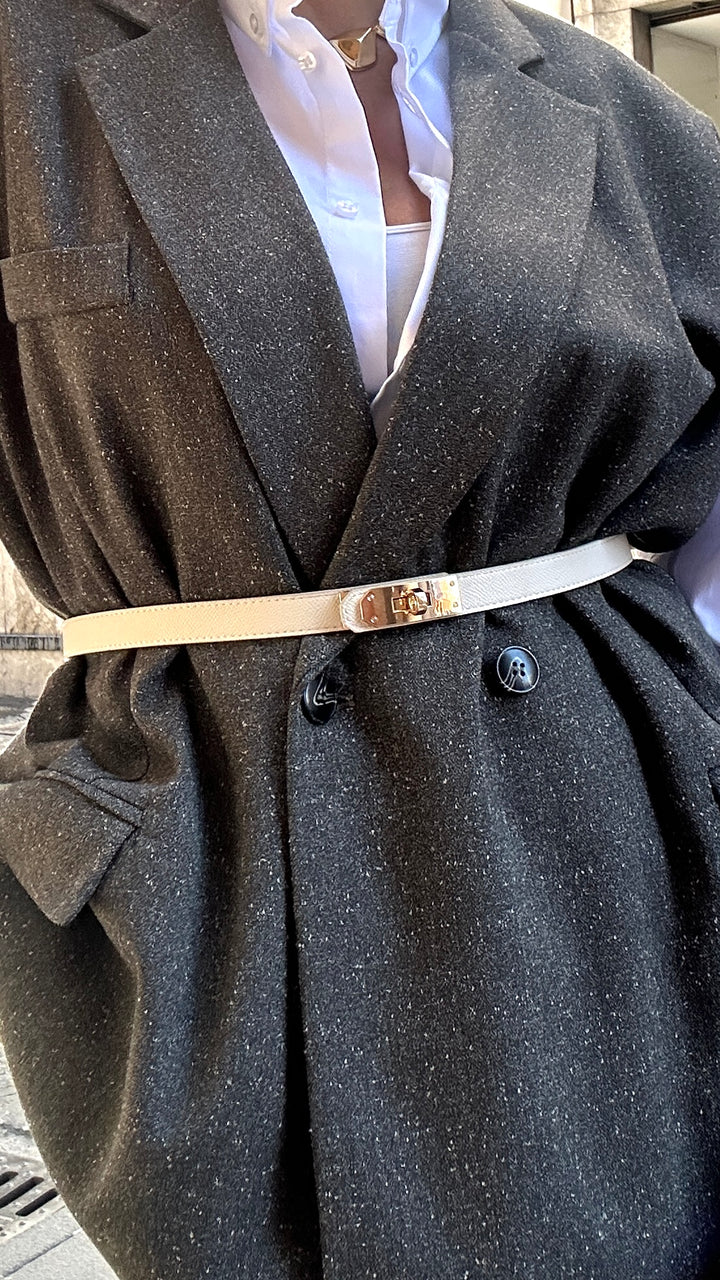 Cinturino in simil pelle con dettaglio oro. La chiusura è sul davanti. Veste fino alla 46