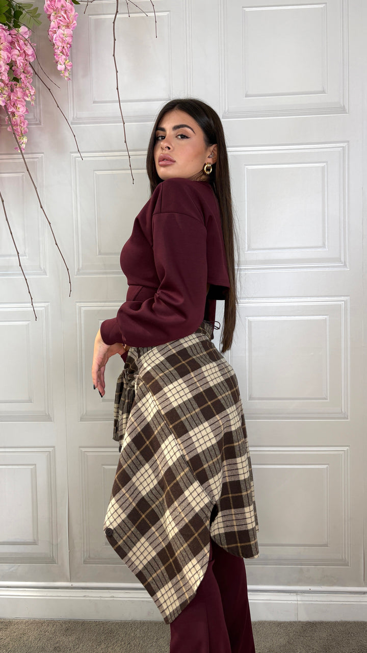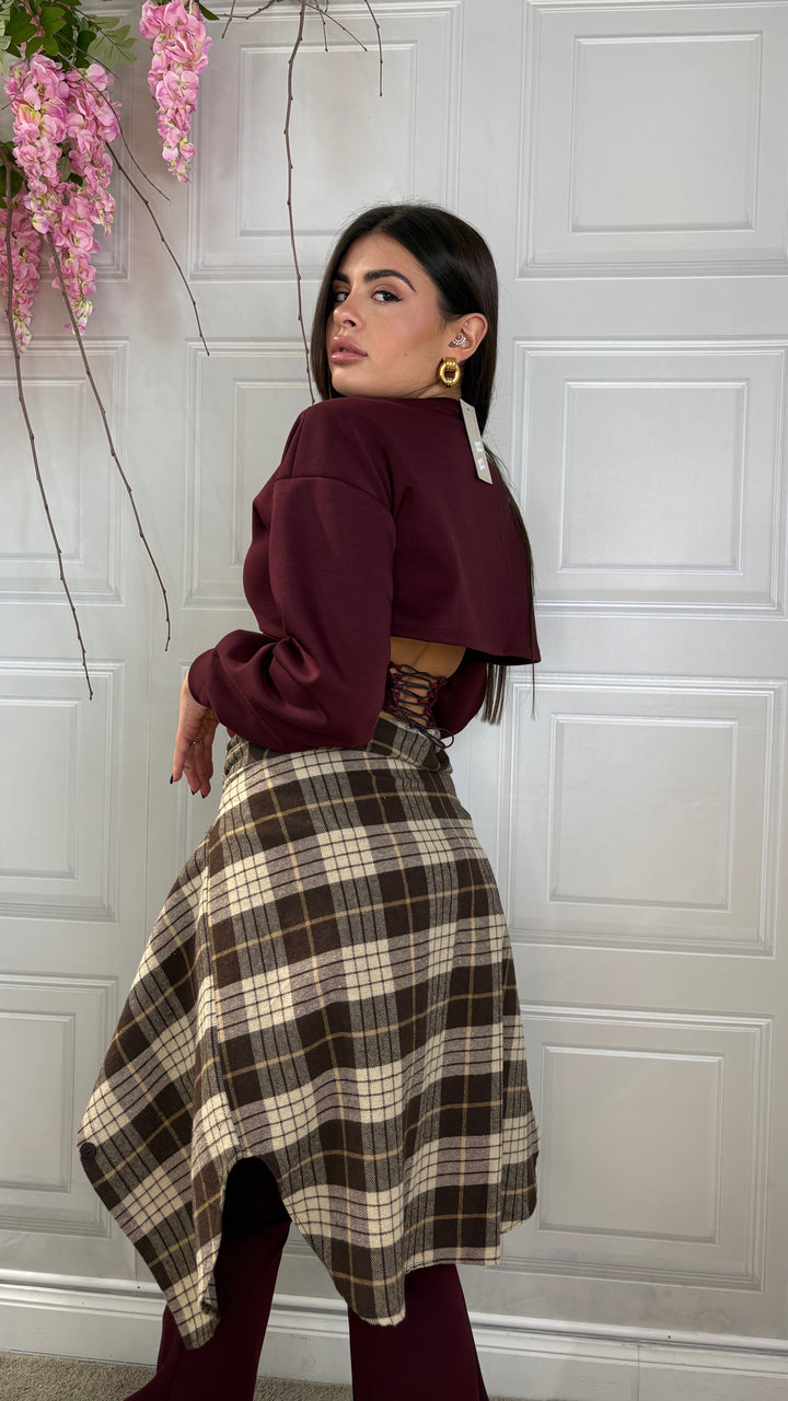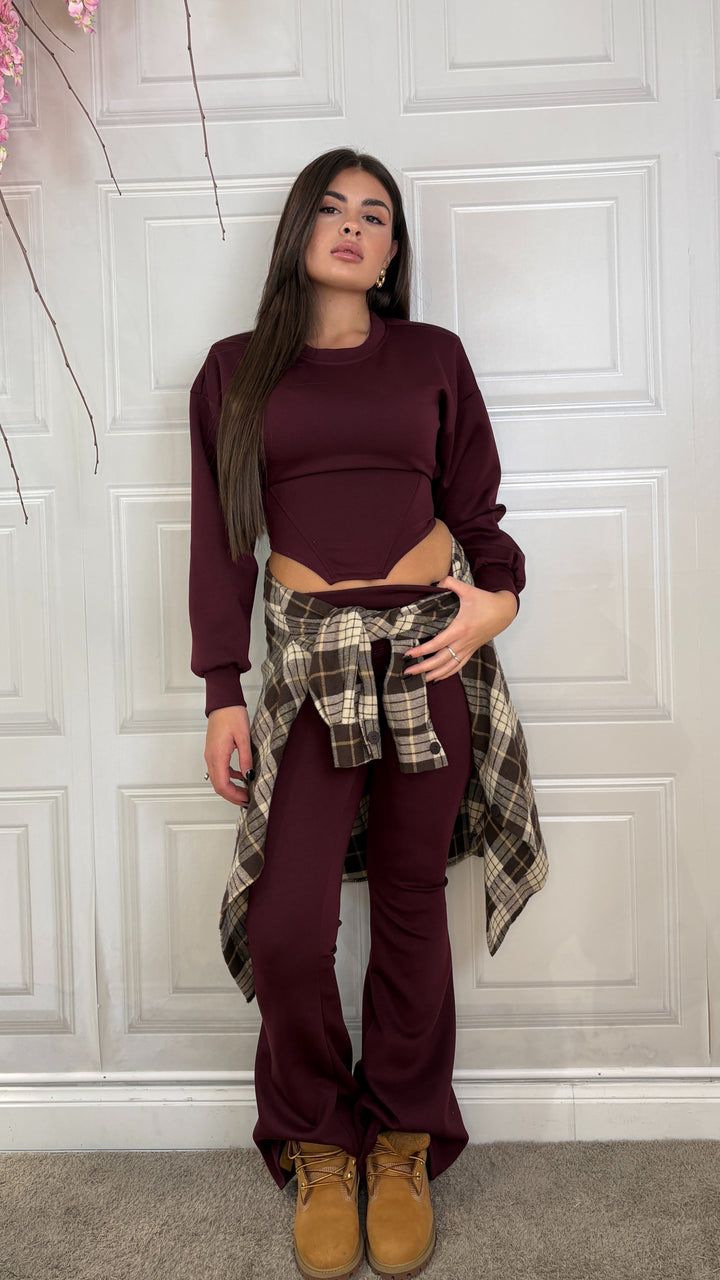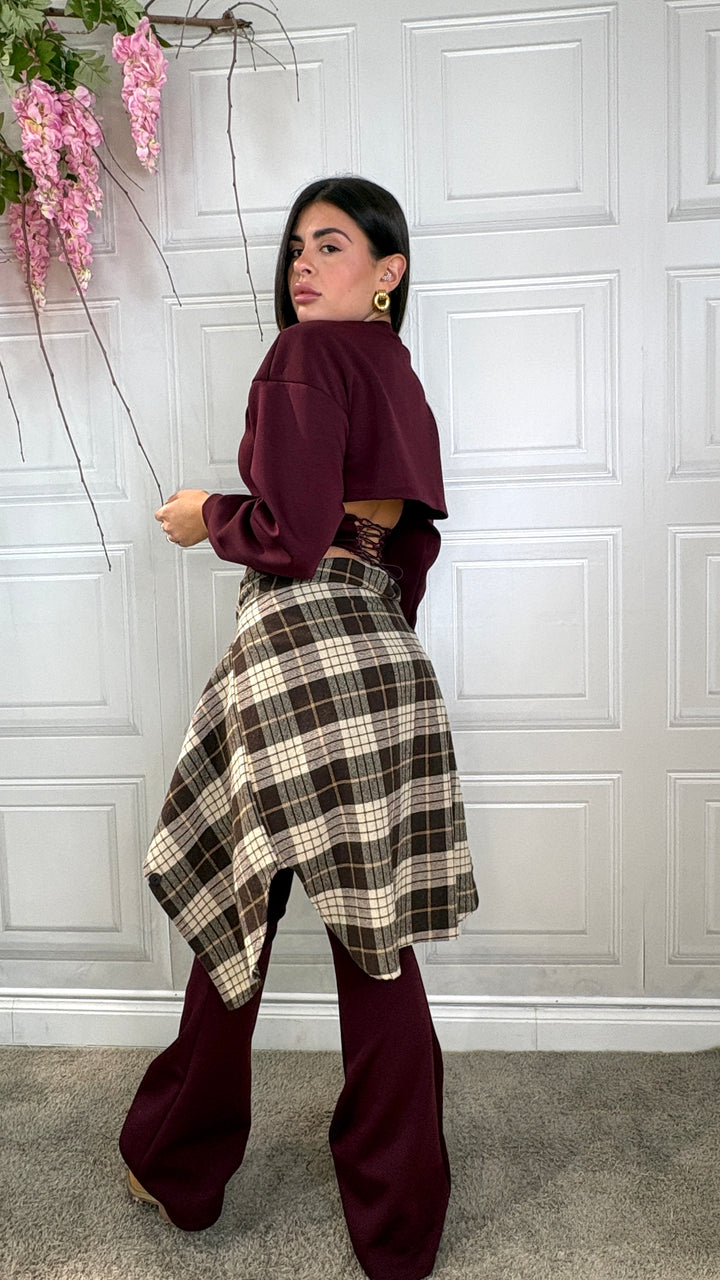 Coordinato composto da maglia crop con spallina interna e coulisse sul retro . I pantaloni sono vita alta con maxi risvolto e scendono a zampa. Veste fino alla 44