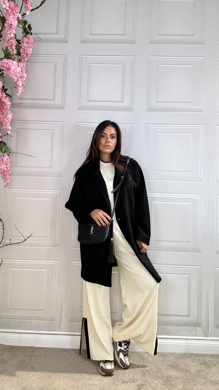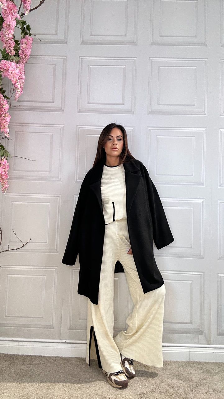 Coordinato in lana rasata a costine, composto da maglia over  a giro collo e pantaloni vita alta con molla elastica e spacchi laterali