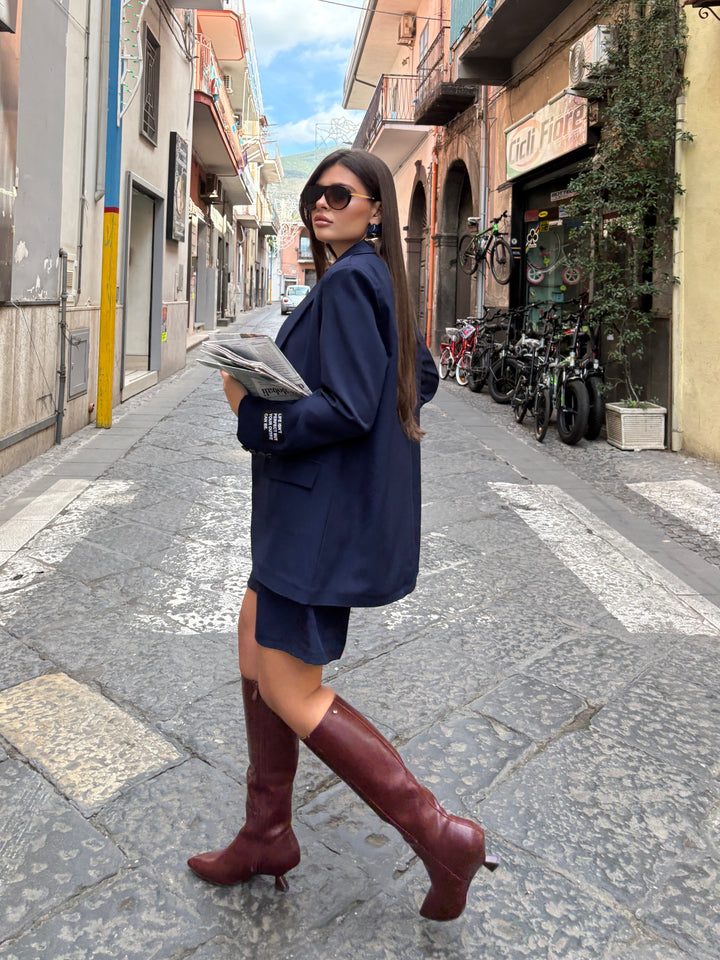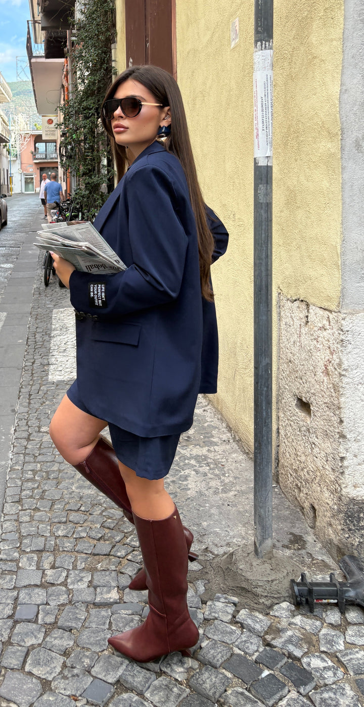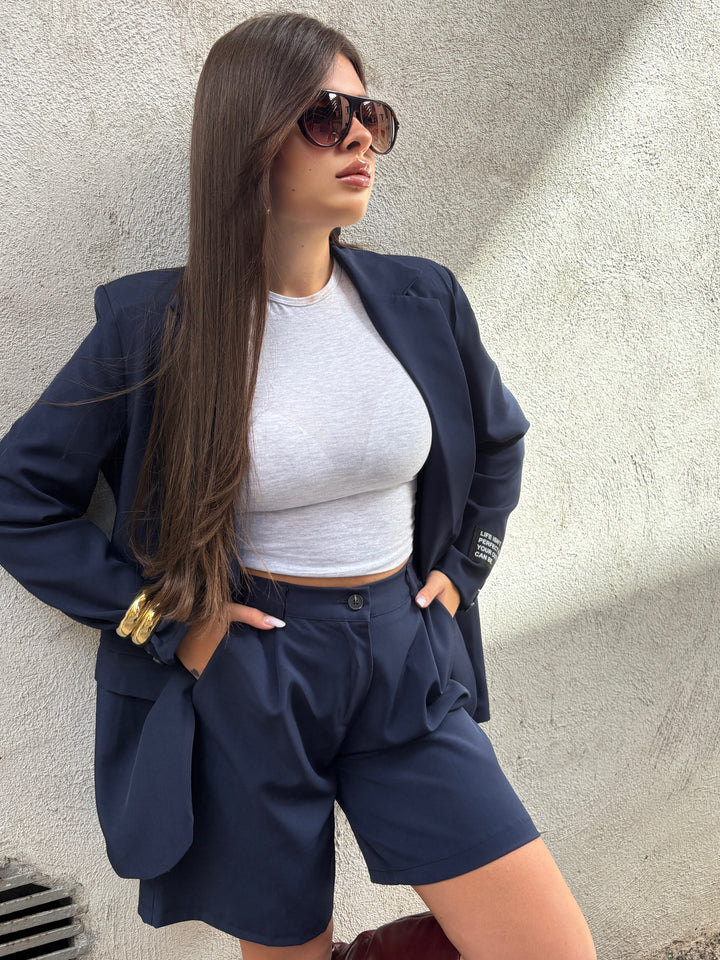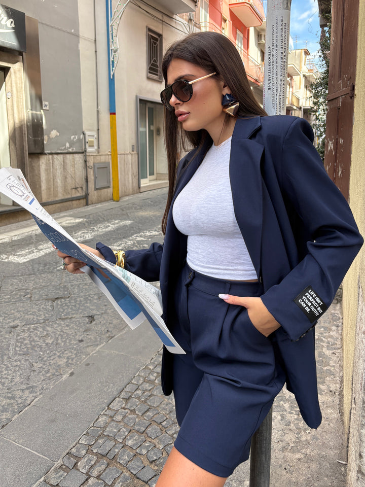 Coordinato in Cady low cost composto da giacca con doppio bottone sul davanti e bermuda con bottone e zip centrale e tasche laterali.