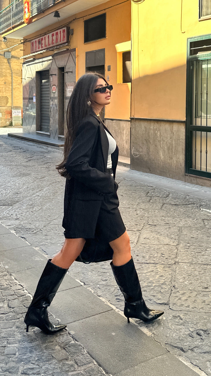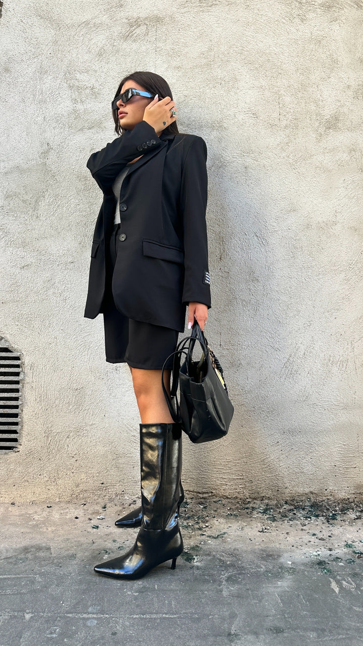 Coordinato in Cady low cost composto da giacca con doppio bottone sul davanti e bermuda con bottone e zip centrale e tasche laterali.