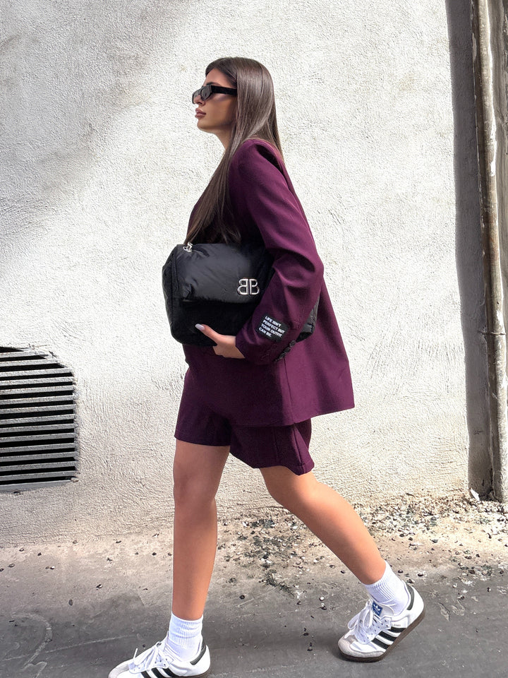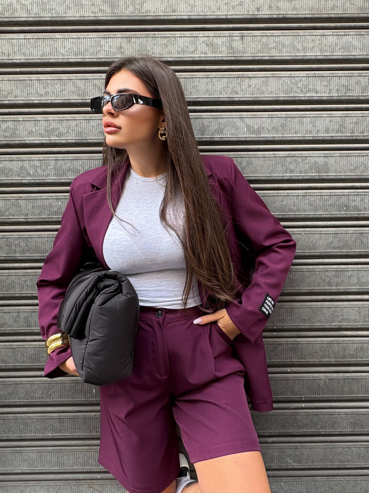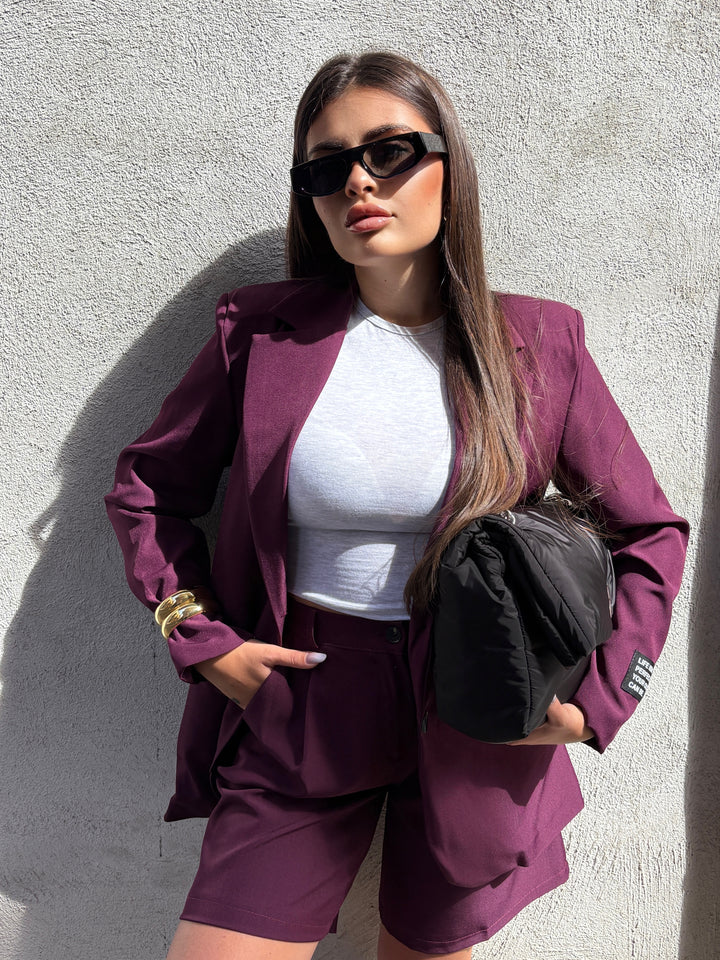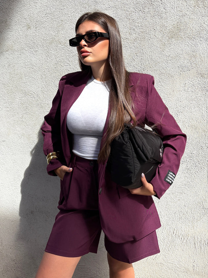 Coordinato in Cady low cost composto da giacca con doppio bottone sul davanti e bermuda con bottone e zip centrale e tasche laterali.