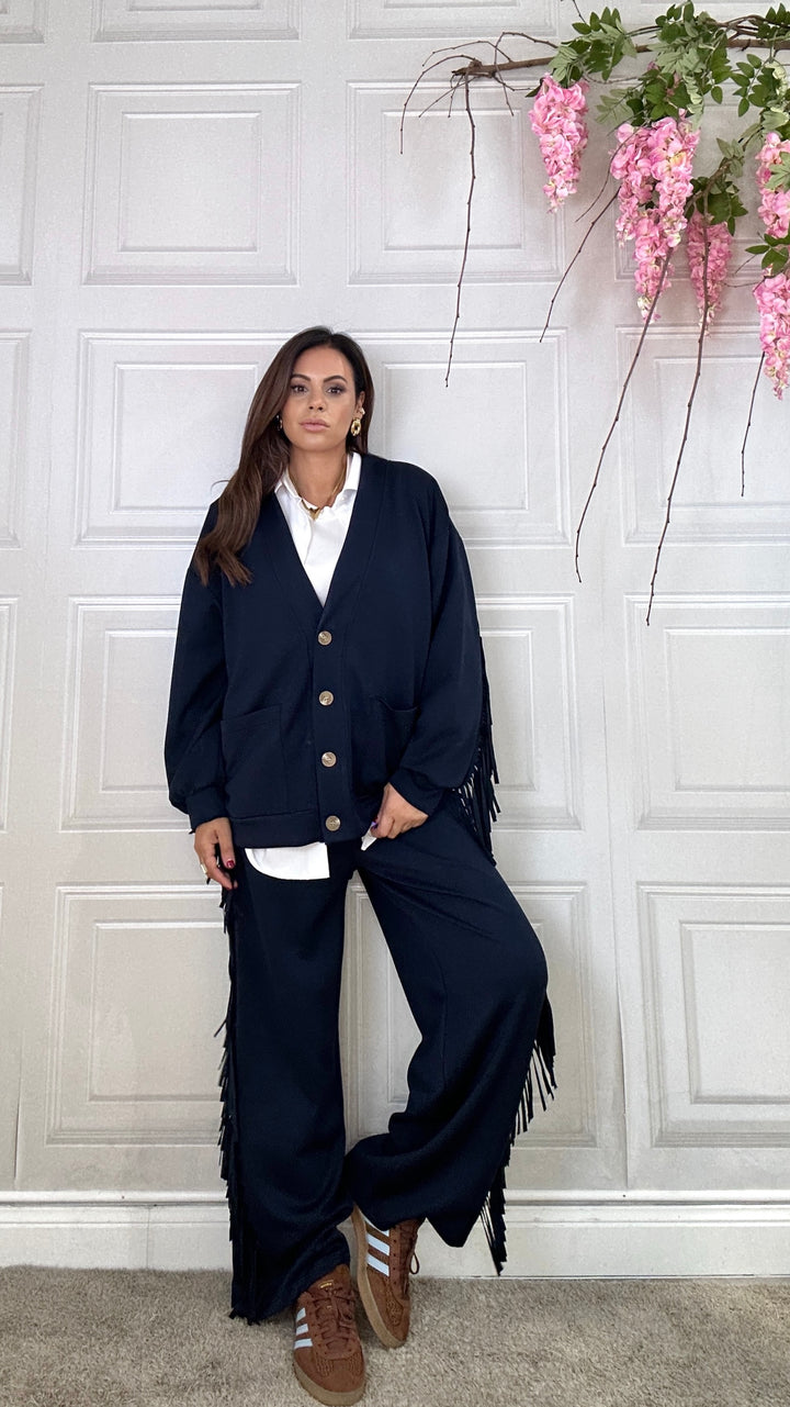 Coordinato formato da cardigan modello over bottoni sul davanti e tasche vere sui fianchi pantaloni con elastico in vita scende a palazzo tessuto tuta morbido,porta le frange sia sul cardigan che sui lati del pantalone