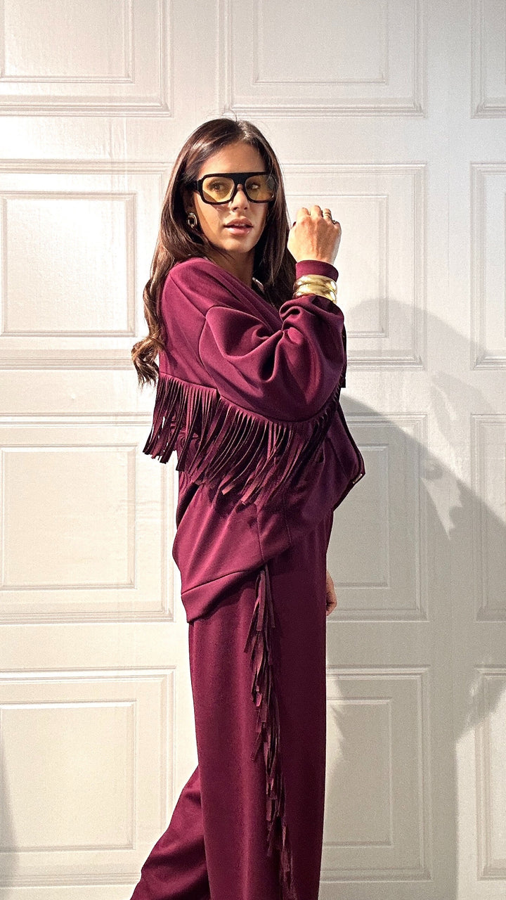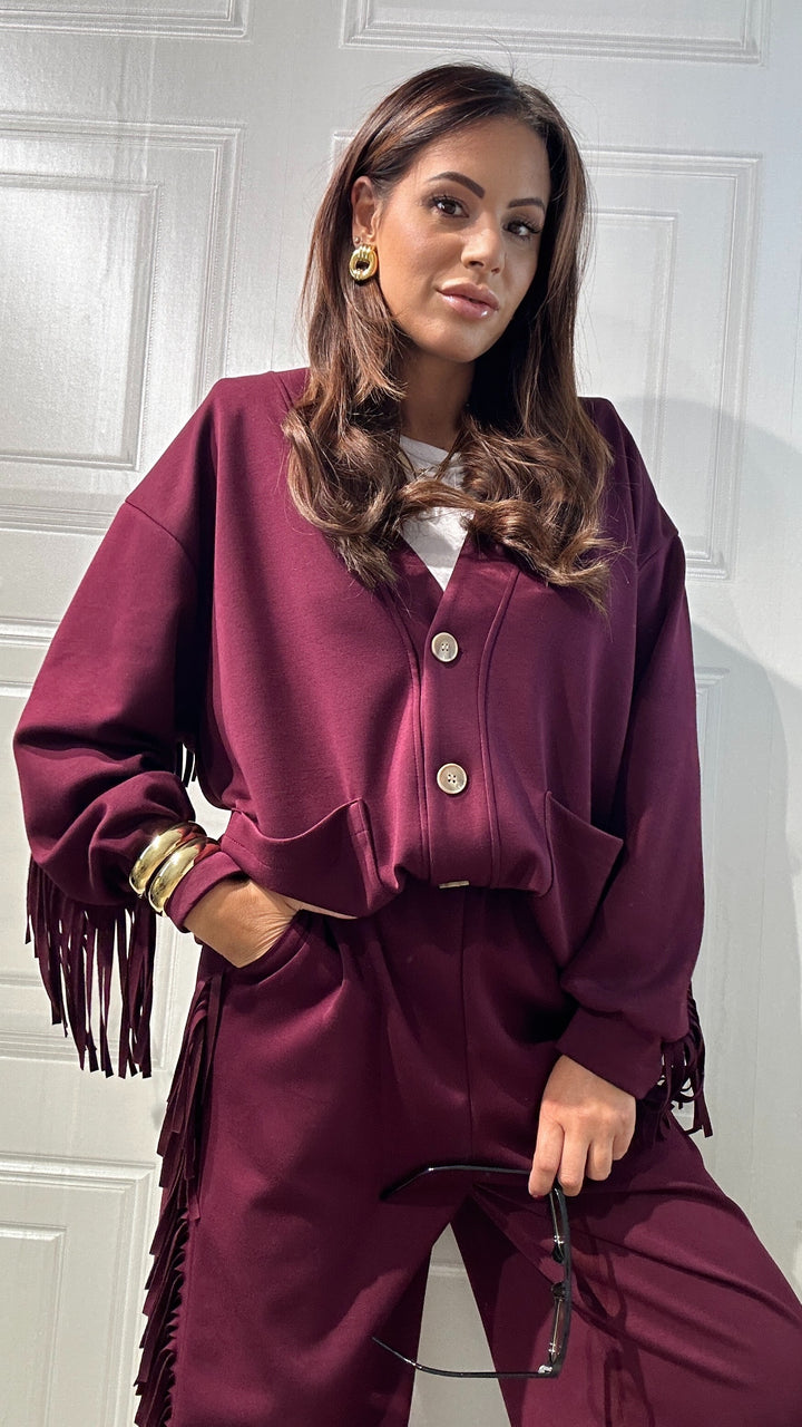 Coordinato formato da cardigan modello over bottoni sul davanti e tasche vere sui fianchi pantaloni con elastico in vita scende a palazzo tessuto tuta morbido,porta le frange sia sul cardigan che sui lati del pantalone