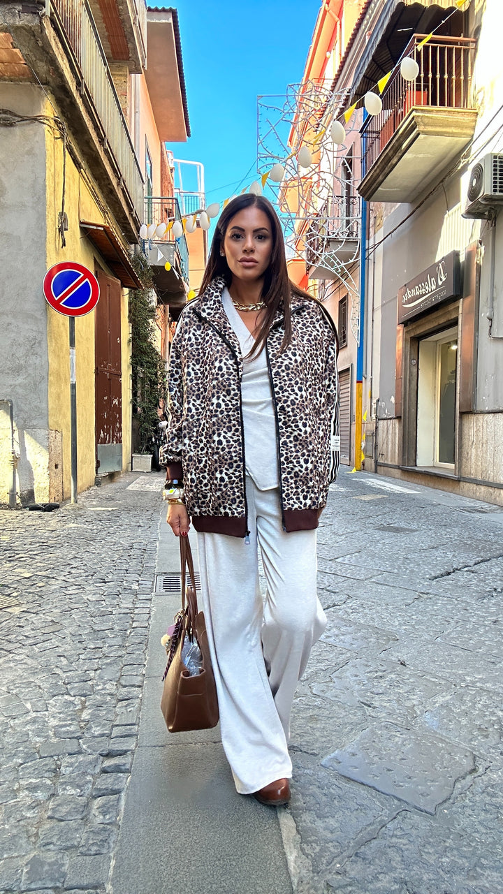 Coordinato in lana rasata composto da maglia a giro con drappeggio laterale. Pantaloni vita alta a zampa con molla elastica in vita.