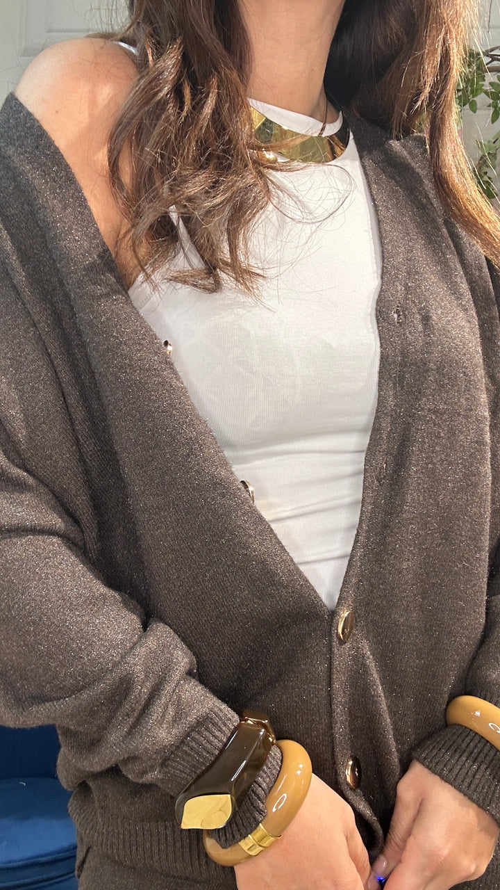 Coordinato in lana morbida composto da maxi cardigan dalla Vestibilita over e pantaloni vita alta con coulisse in vita, gamba larga e lunghi quindi adatti alle più alte. Tutto il coordinato è taglia unica e veste fino alla 48