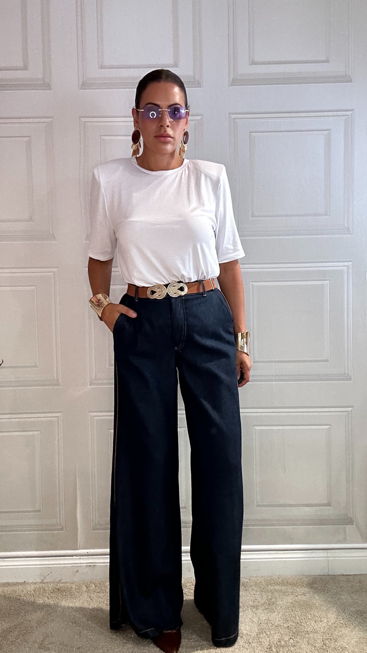 Pantaloni: vita alta con bottone e zip centrali e tasche sul davanti scendono a zampa in un movimento fluido che li rendono comodissimi per un look giornaliero