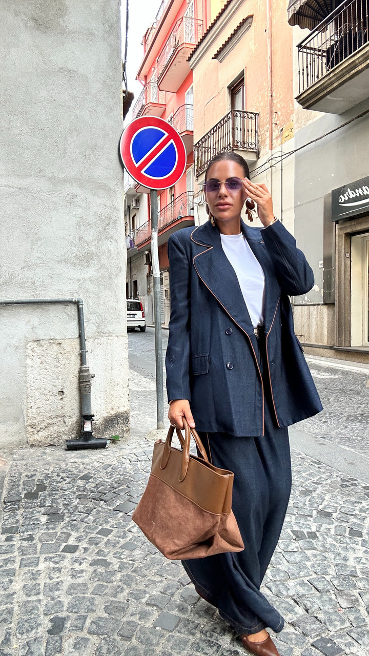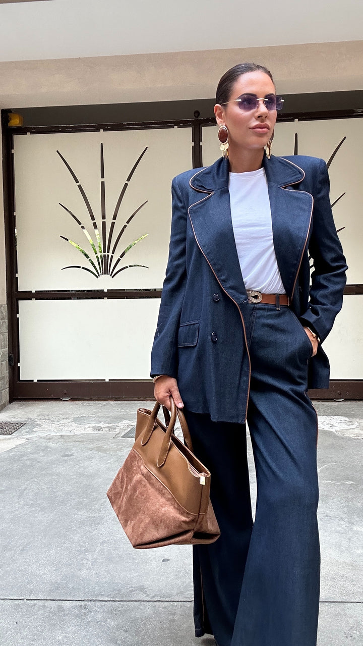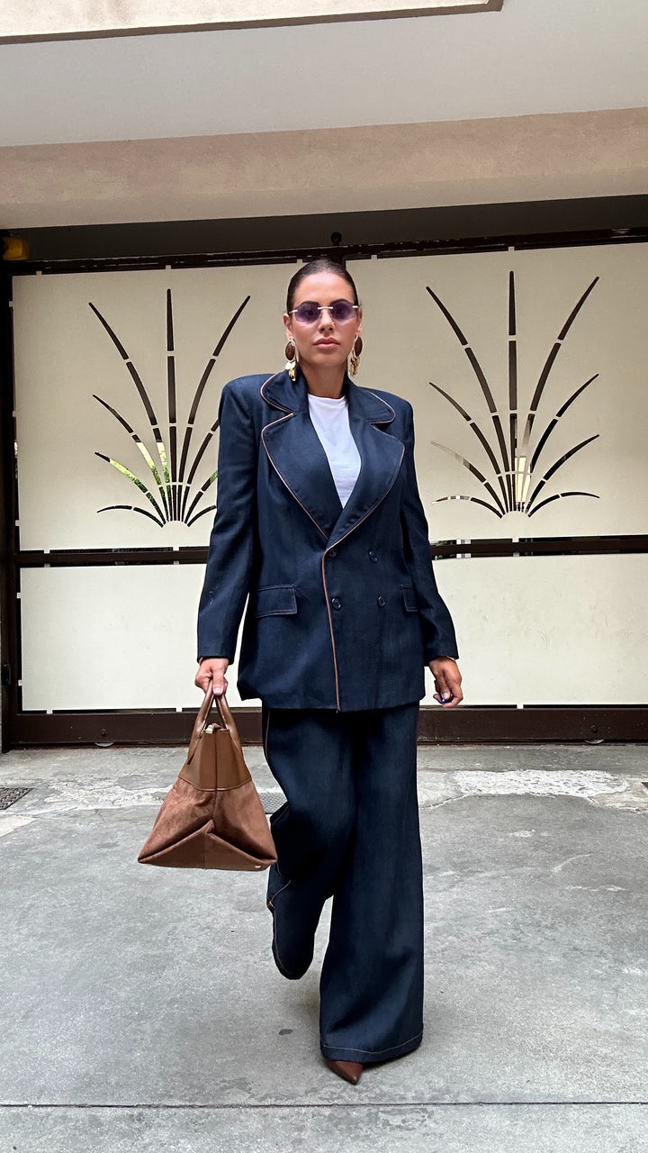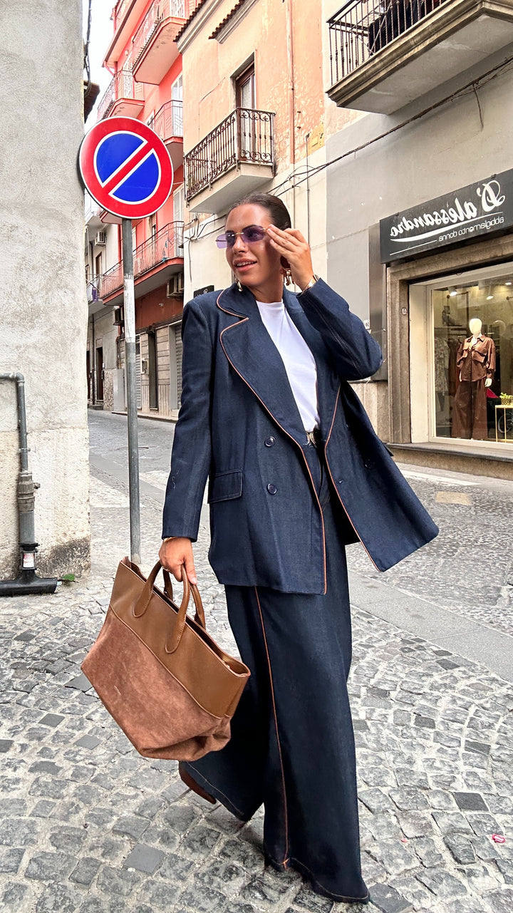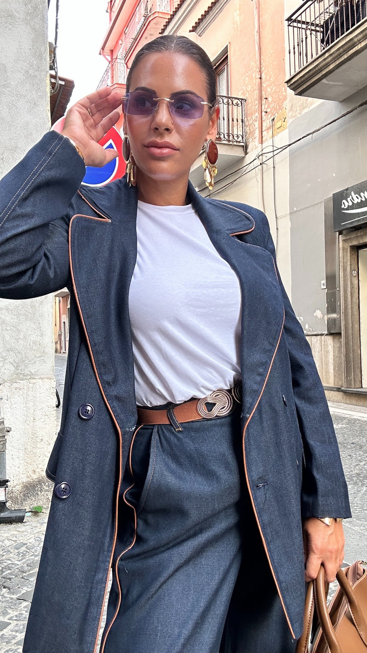Giacca: in Denim e cotone morbido mantiene un effetto strutturato a doppio petto con bottone interno ed esterno. Mordi a ma strategicamente avvitata.