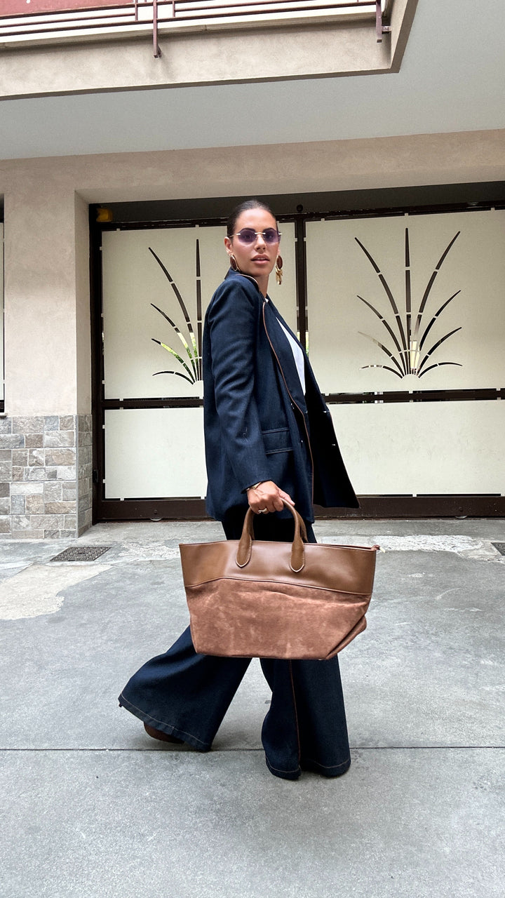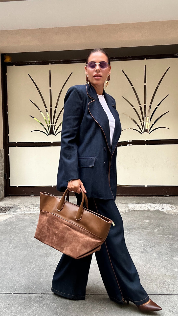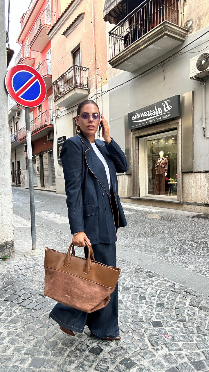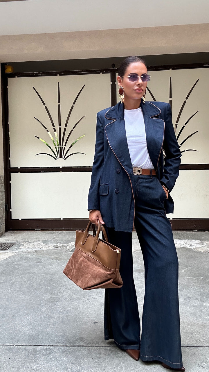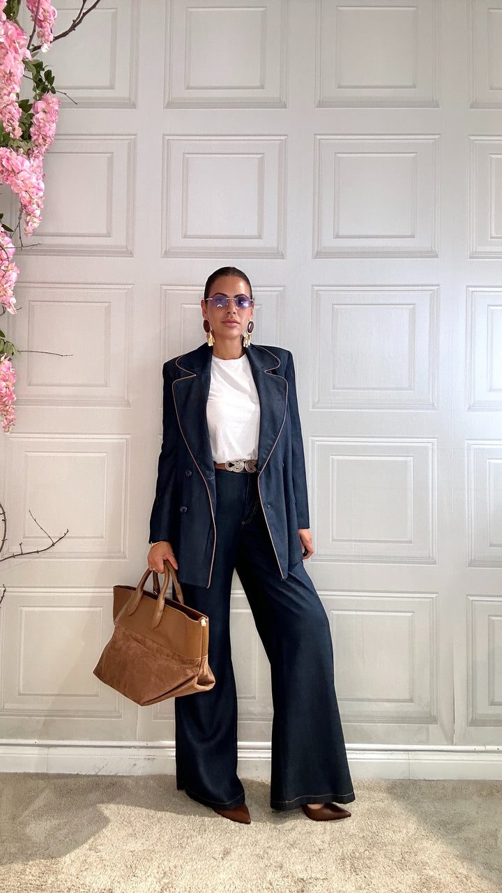 Giacca: in Denim e cotone morbido mantiene un effetto strutturato a doppio petto con bottone interno ed esterno. Mordi a ma strategicamente avvitata.