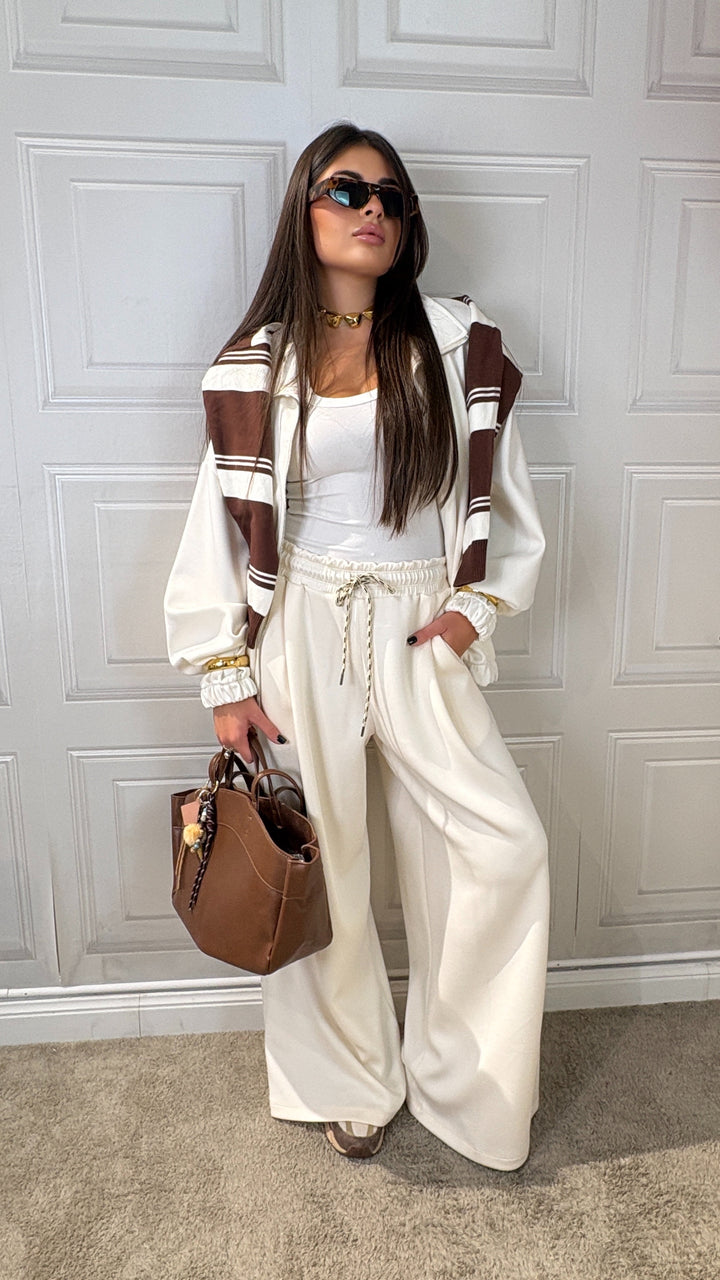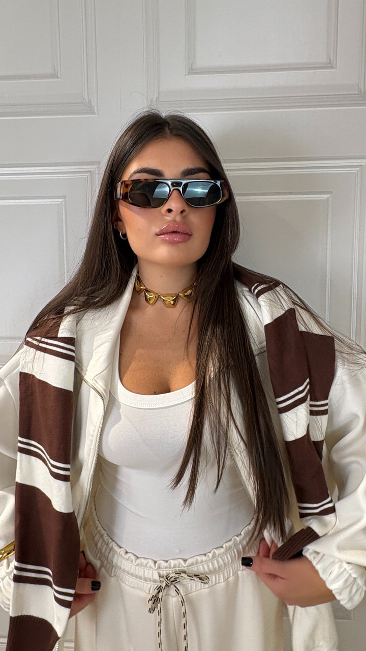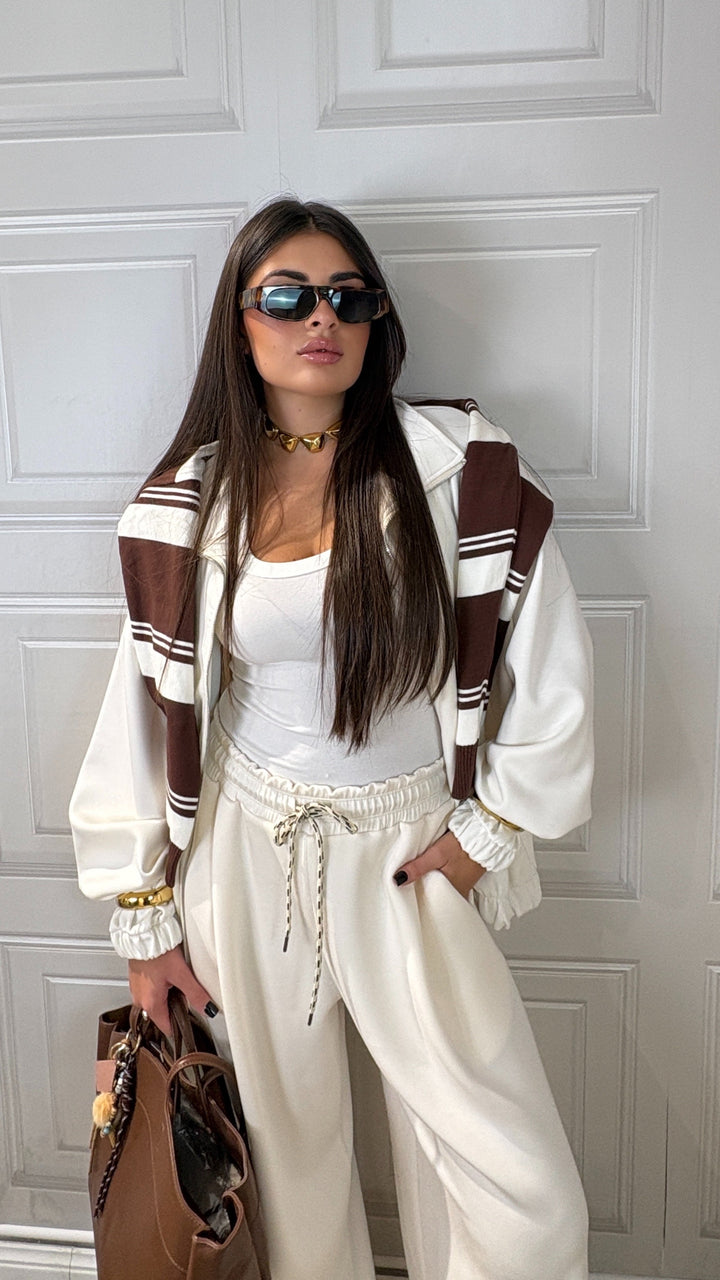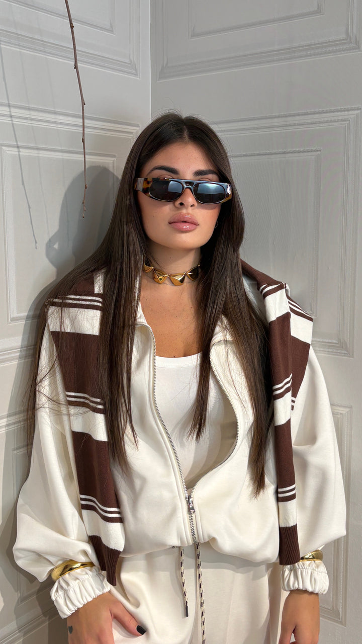 Coordinato Lumina composto da felpa over con zip, cappuccio. Pantaloni con molla elastica in vita e tasche laterali. L ‘ interno è garzato
