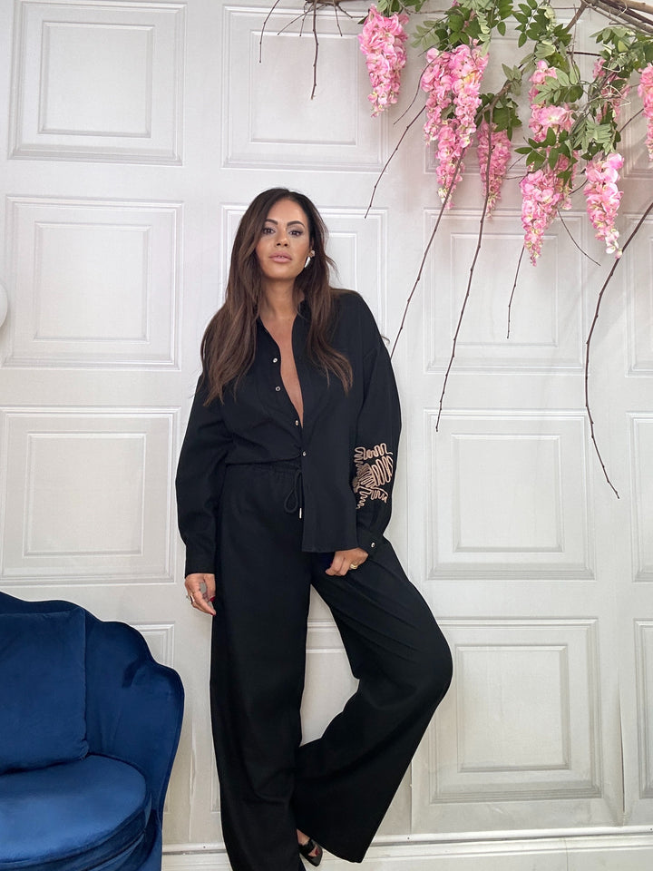Coordinato ideato e prodotto in Italia, il suo tessuto è eccellente. 35% cotone caldo. Composto ca camicia over con tagli laterali. Pantaloni con coulisse in vita che valorizza il punto vita e gamba larga. Le taglie disponibili sono S M L.