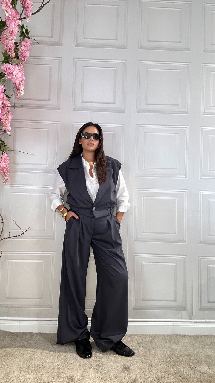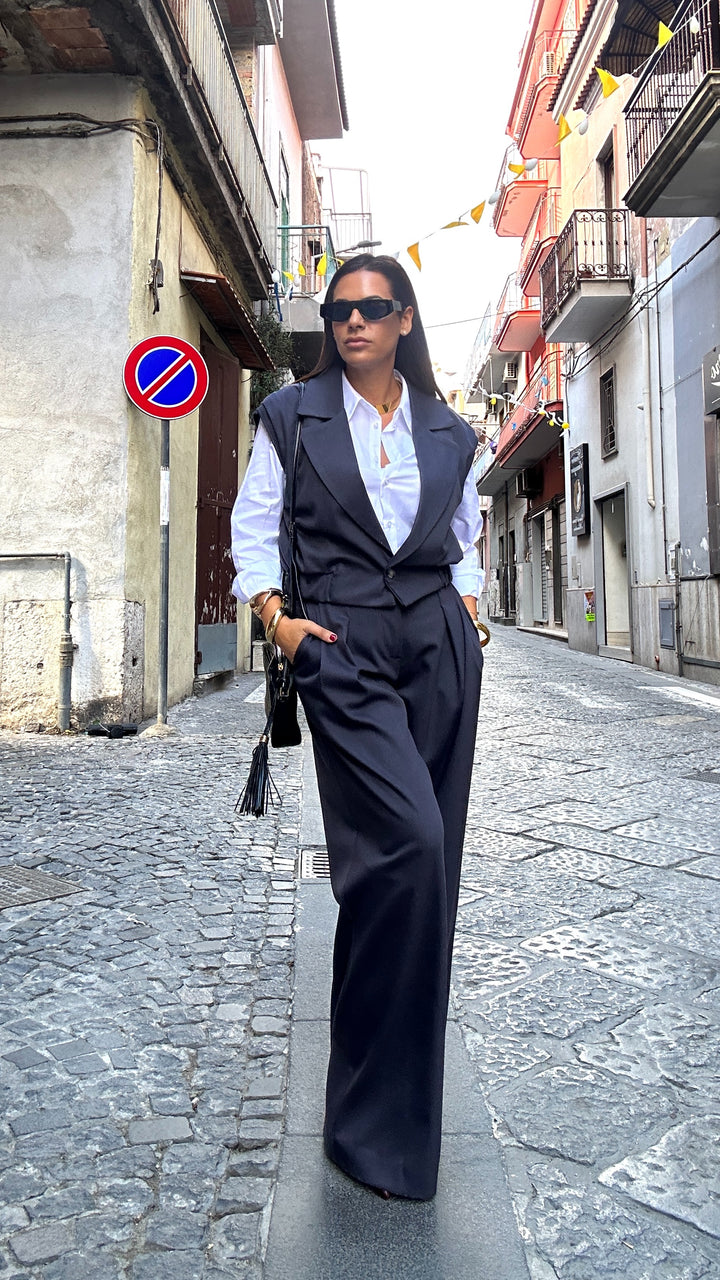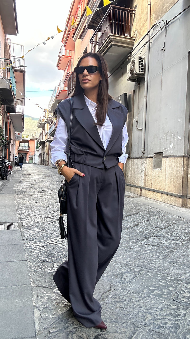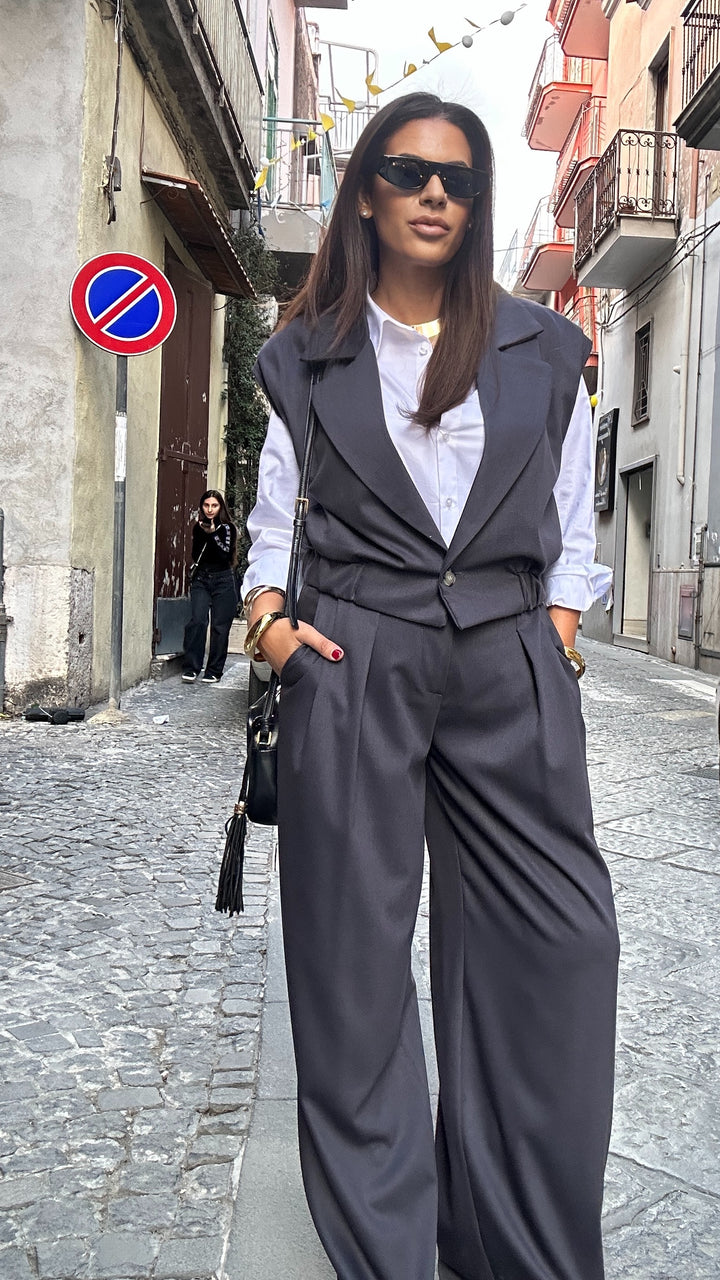 Coordinato in caldo cotone prodotto in Italia già dal tessuto fino ad arrivare alla manifattura. Questo coordinato è bellissimo ed è composto da gilet con scollatura ampia a punta e bottone finale. I pantaloni sono vita alta con bottone e zip centrale. Le tasche laterali. La Vestibilita è regolare