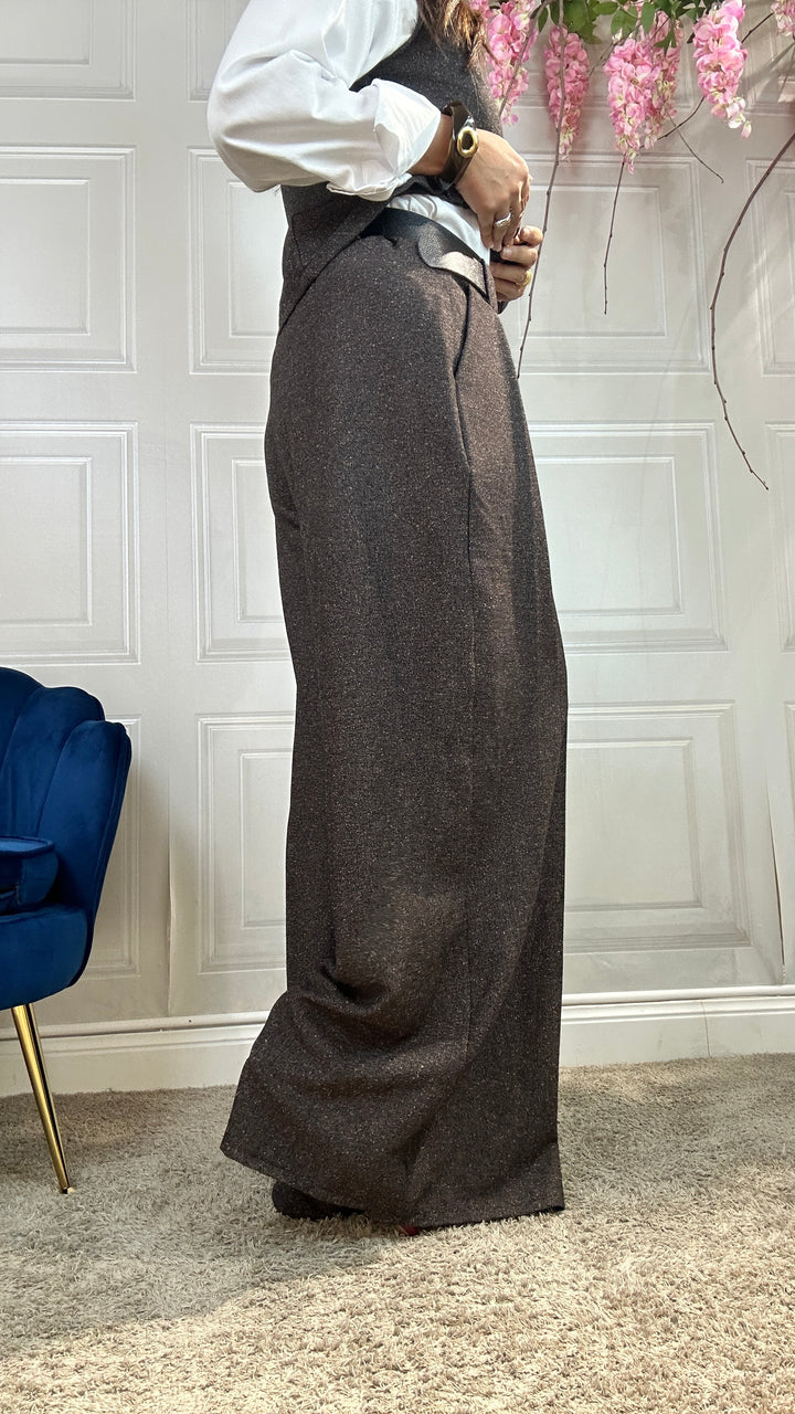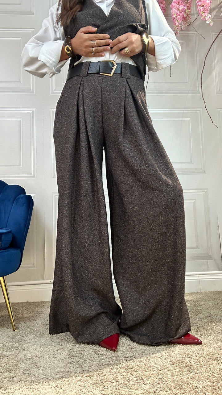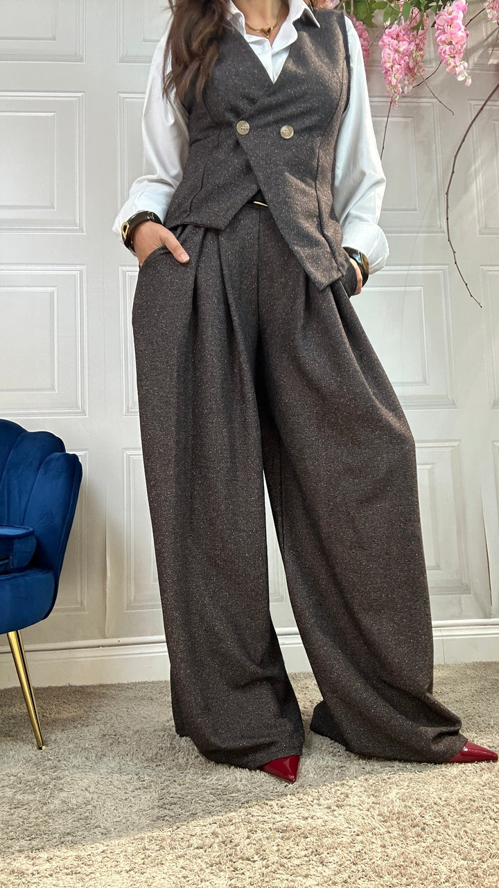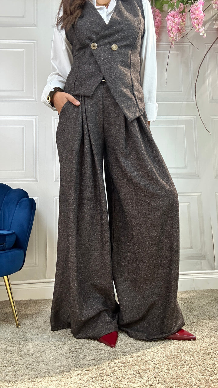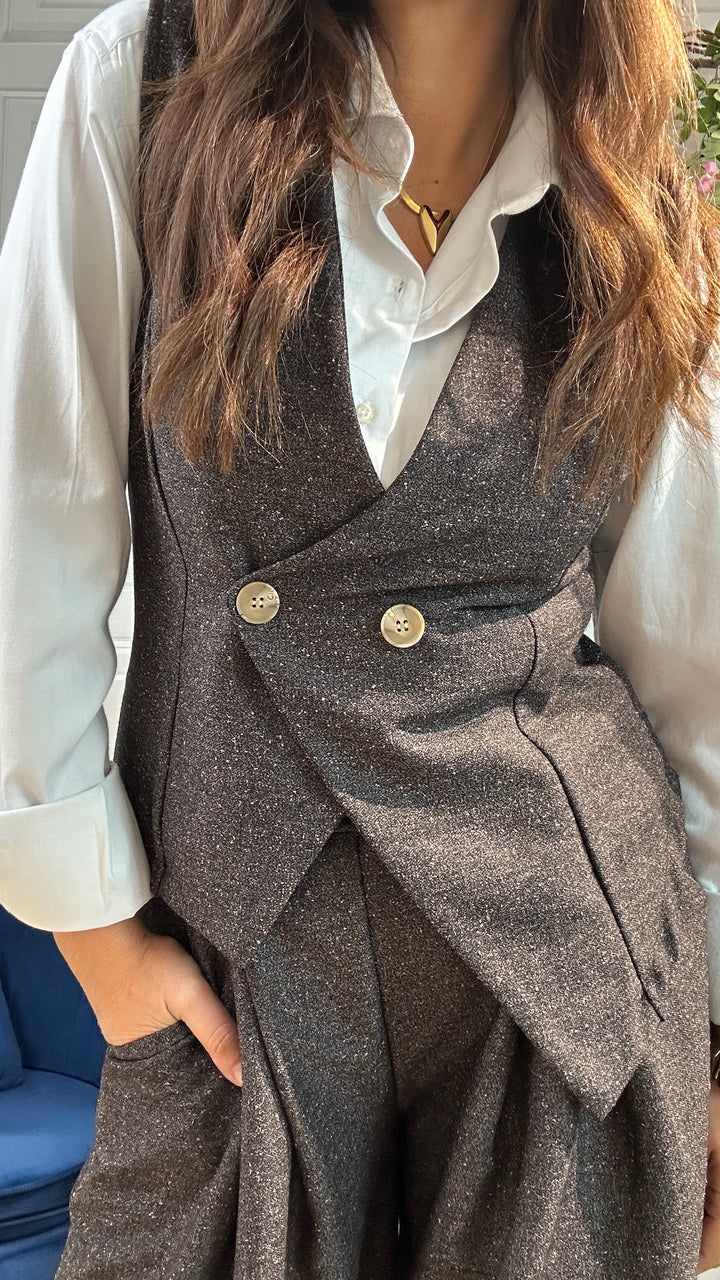 Coordinato composto da gilet con doppia chiusura, interna ed esterna. Valorizzato il punto vita. I pantaloni sono larghissimi di gamba, hanno le tasche laterali. Vita alta con le pence. Molla elastica invita. Adatto questo completo per una donna sofisticata che ama essere elegante e sobria in ogni momento della giornata