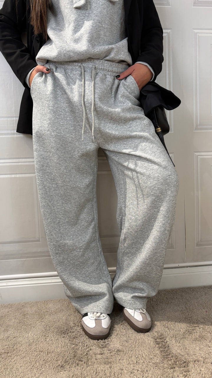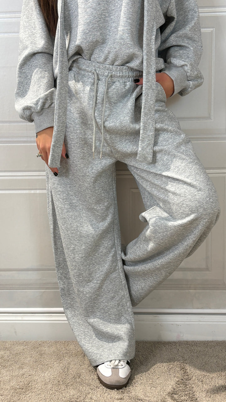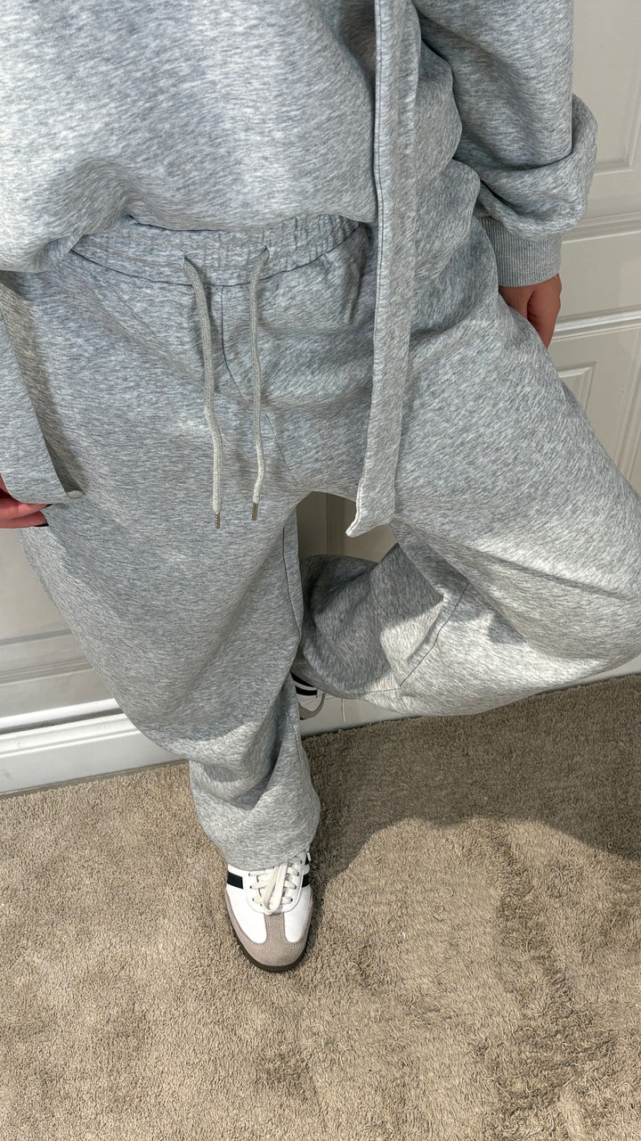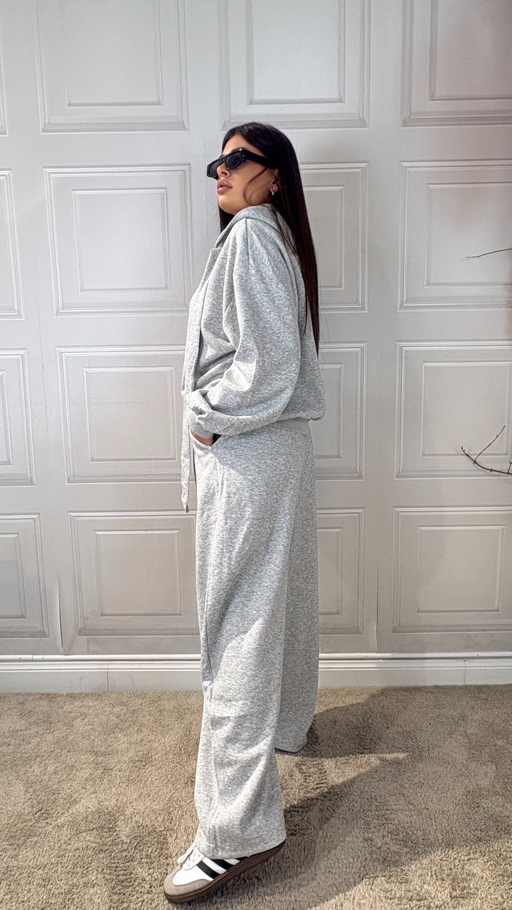 Coordinato composto da maxi felpa con cappuccio e fusciacca al collo. Pantaloni con molla elastica in vita e tasche laterali.
