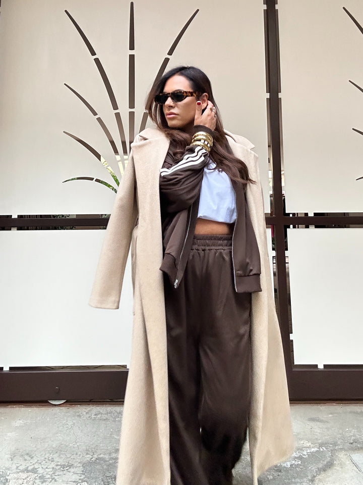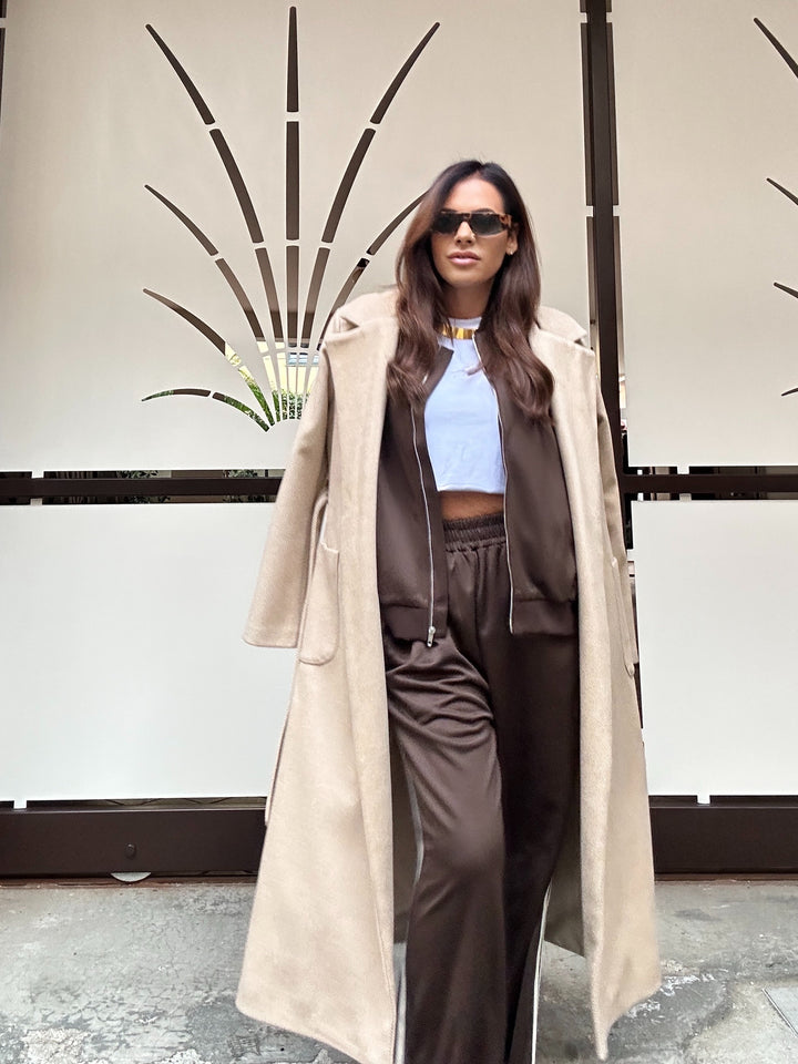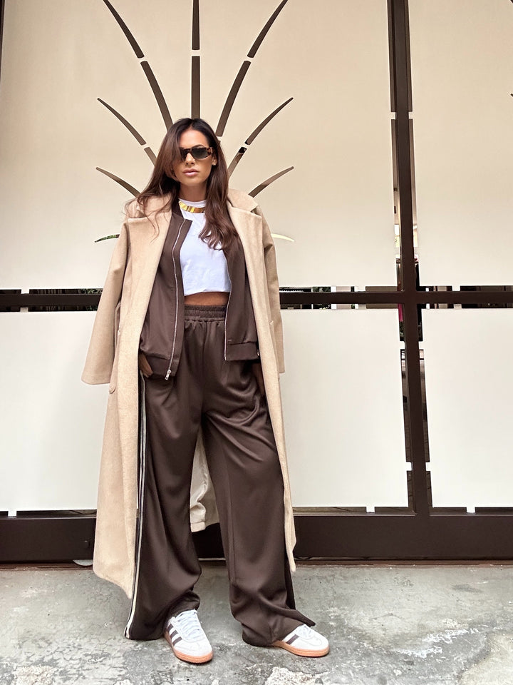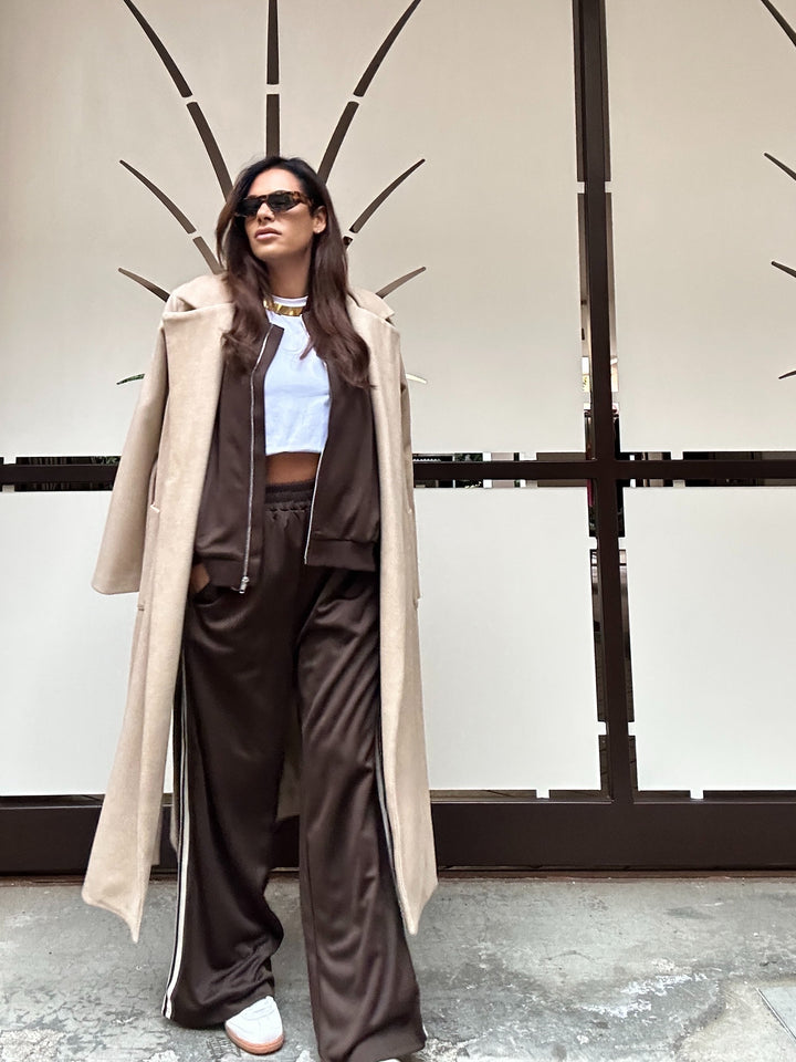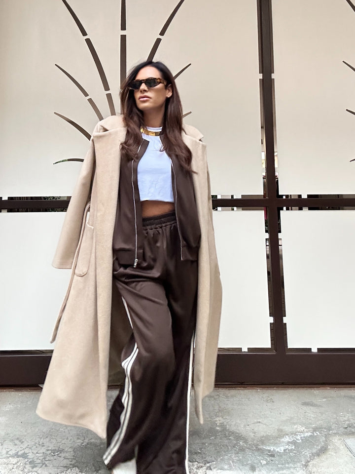 Coordinato taglia unica composto da felpa modello over con cerniera in acciaio e tasche sui fianchi e pantaloni taglia unica elastico in vita e scende dritto con tasche