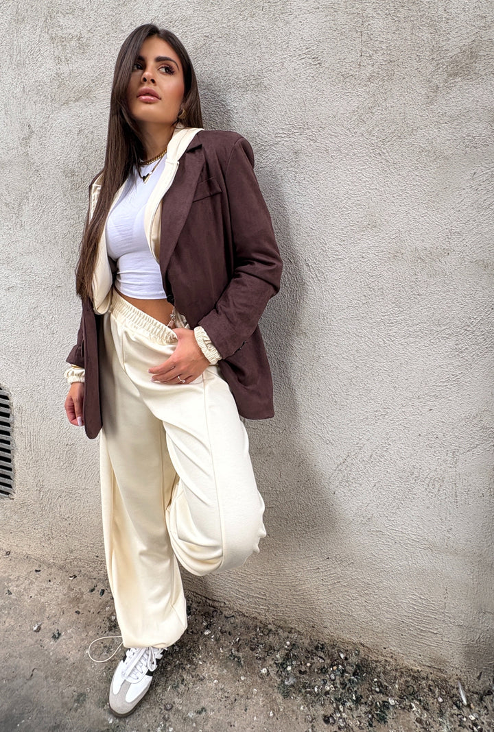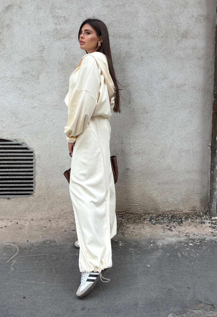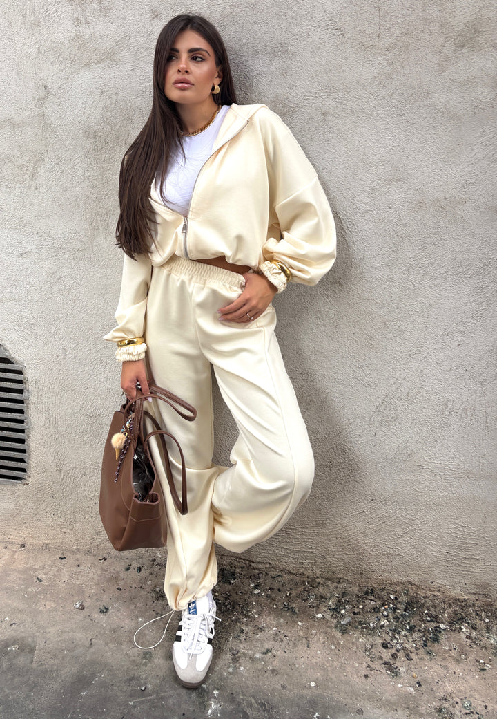 Coordinato tuta premium quality composto da felpa corta con cappuccio, zip sul davanti e coulisse alla base così potete ottenere un effetto bomber. I pantaloni sono vita alta con molla elastica in vita e alla base portano la stessa coulisse della felpa così potete stringerli. Veste fino alla 48