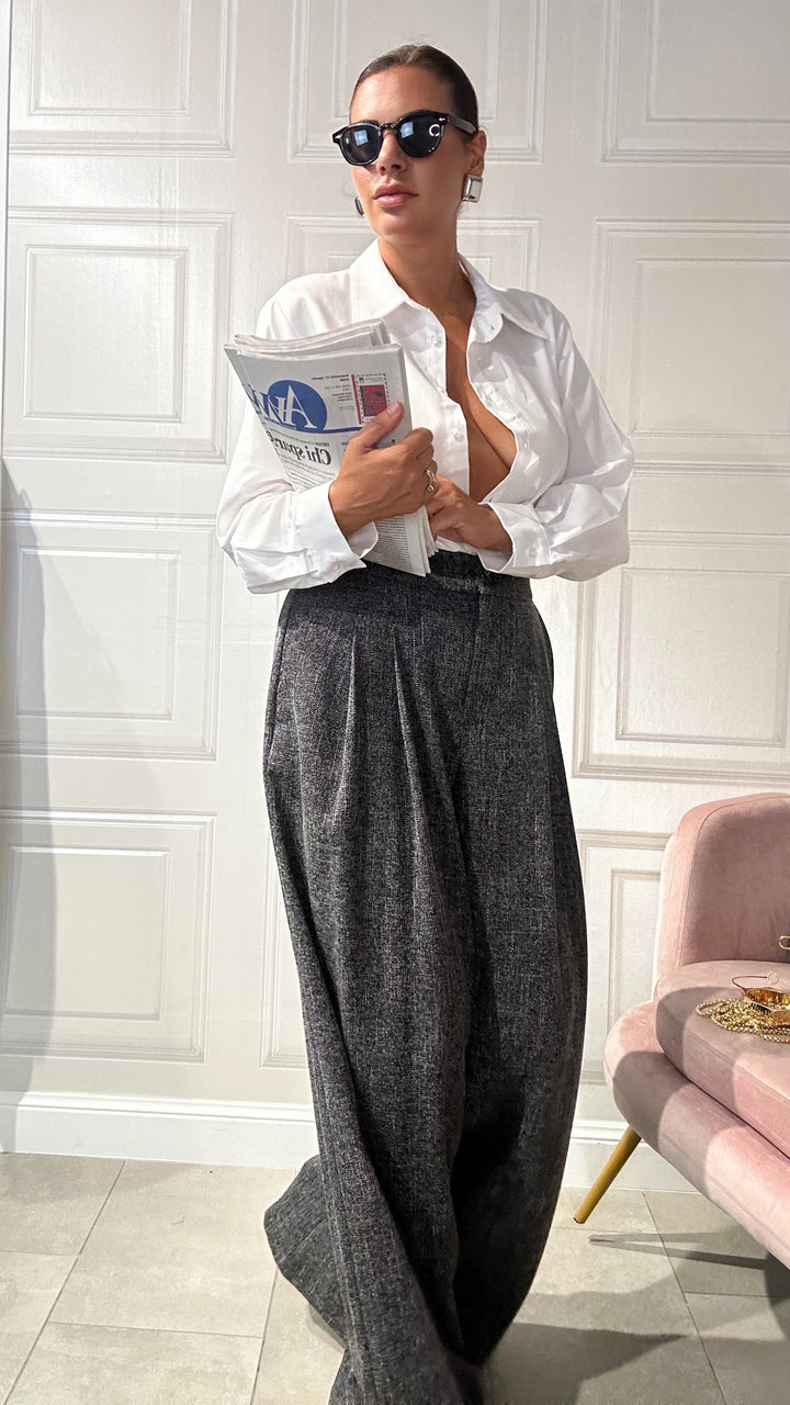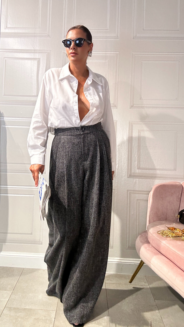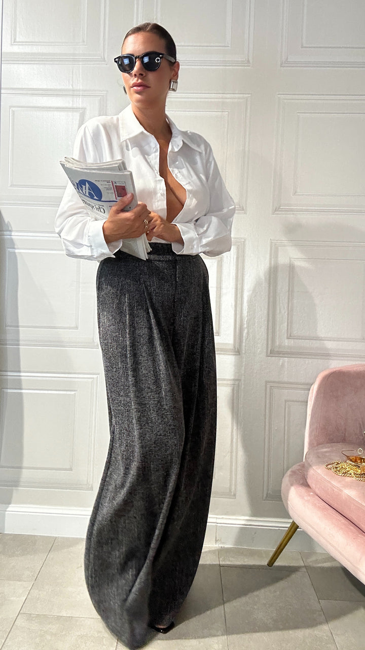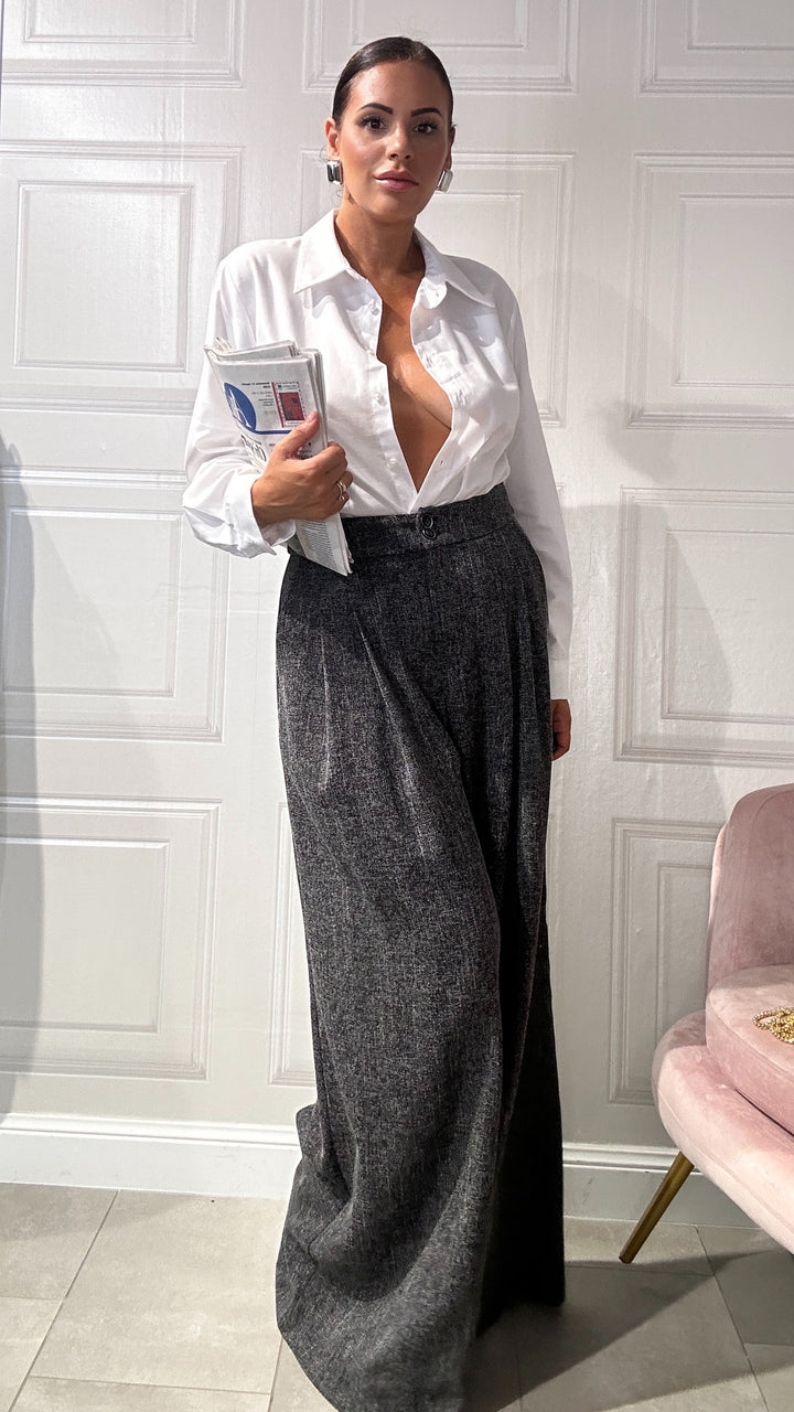 questi pantaloni sono un must-have essenziale da avere nel tuo armadio che combina comfort e stile sofisticato. Realizzati in un tessuto morbido e leggero, questi pantaloni a gamba larga offrono una vestibilità fluida che si adatta perfettamente a qualsiasi occasione.Che sia una giornata in ufficio o l’invito improvviso a un’eventualità.