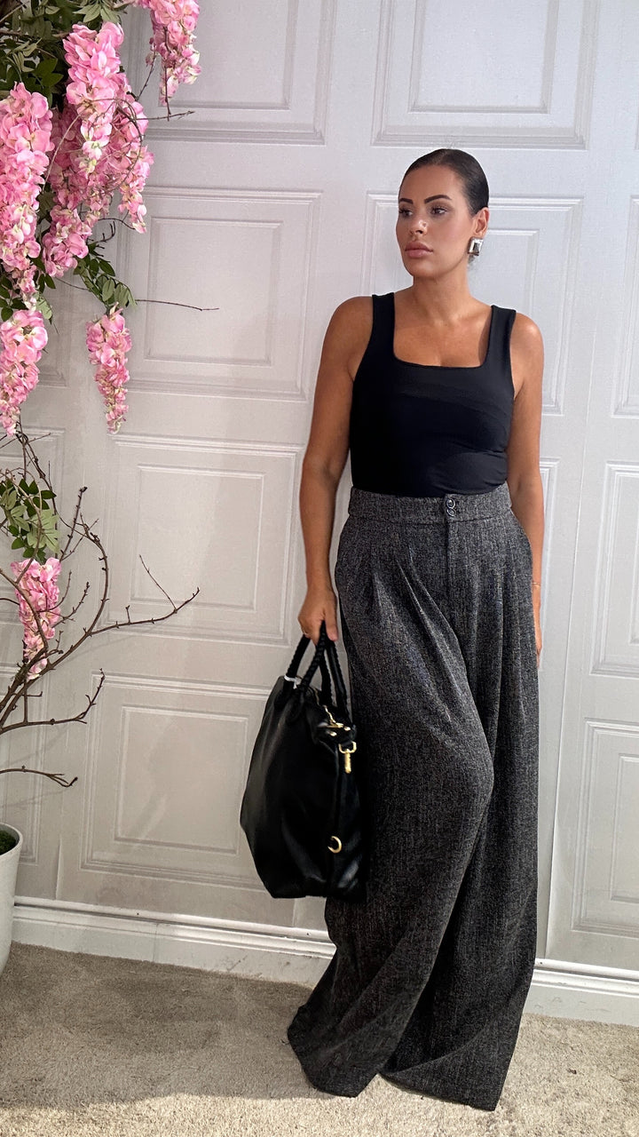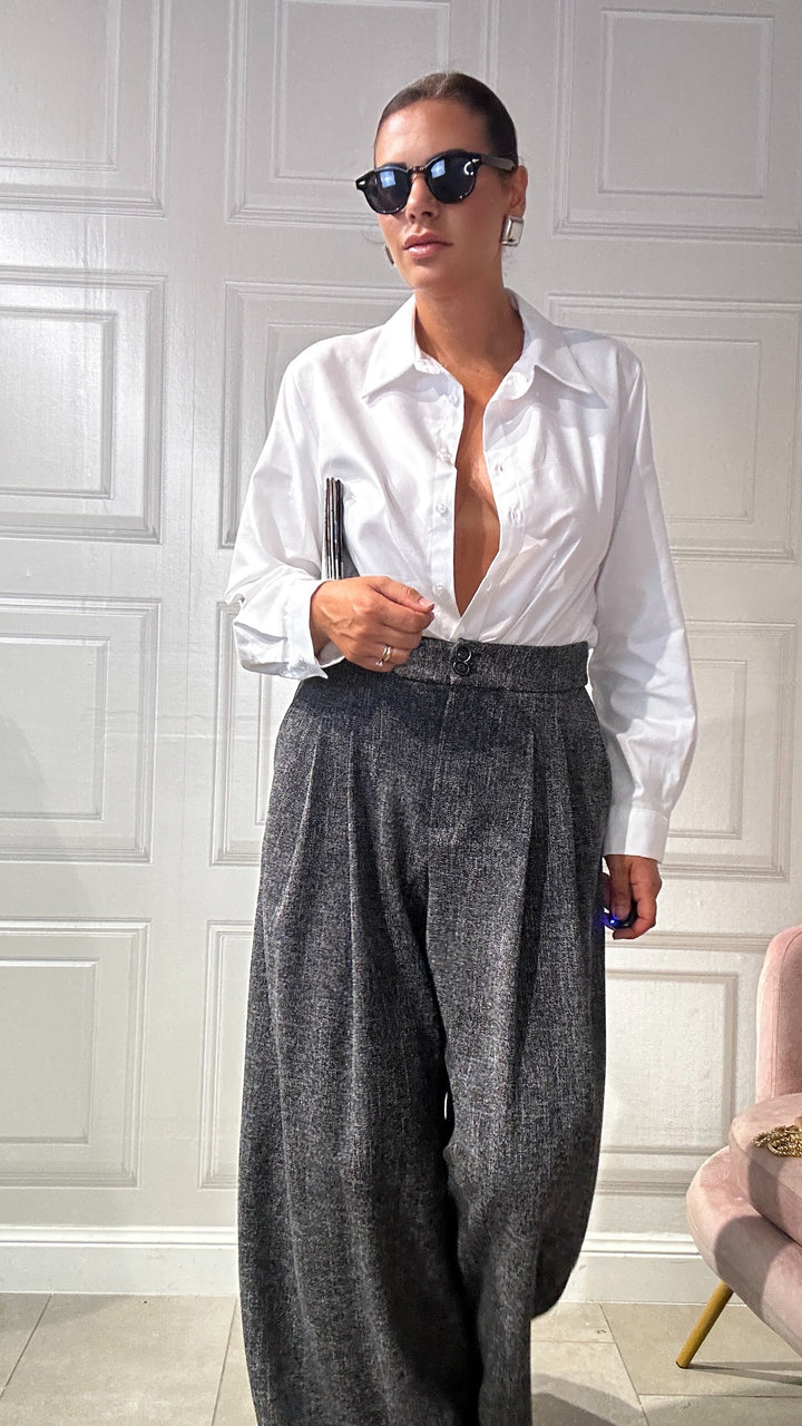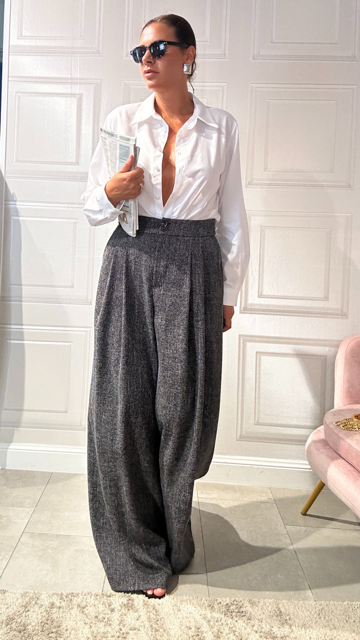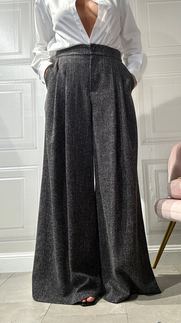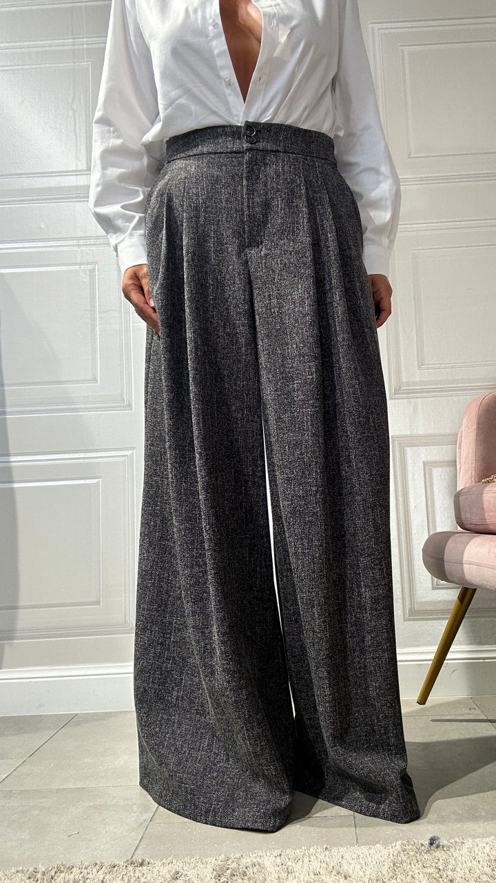 questi pantaloni sono un must-have essenziale da avere nel tuo armadio che combina comfort e stile sofisticato. Realizzati in un tessuto morbido e leggero, questi pantaloni a gamba larga offrono una vestibilità fluida che si adatta perfettamente a qualsiasi occasione.Che sia una giornata in ufficio o l’invito improvviso a un’eventualità.