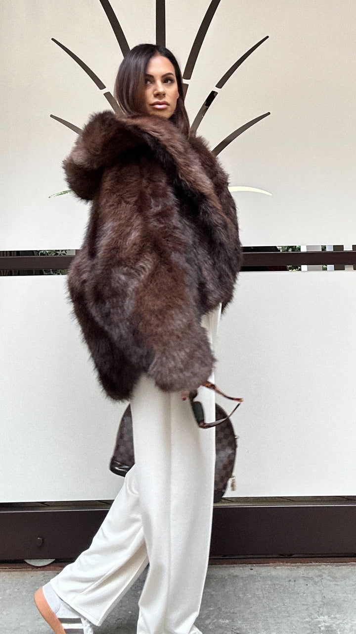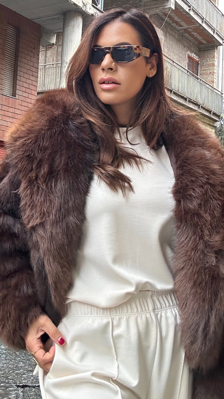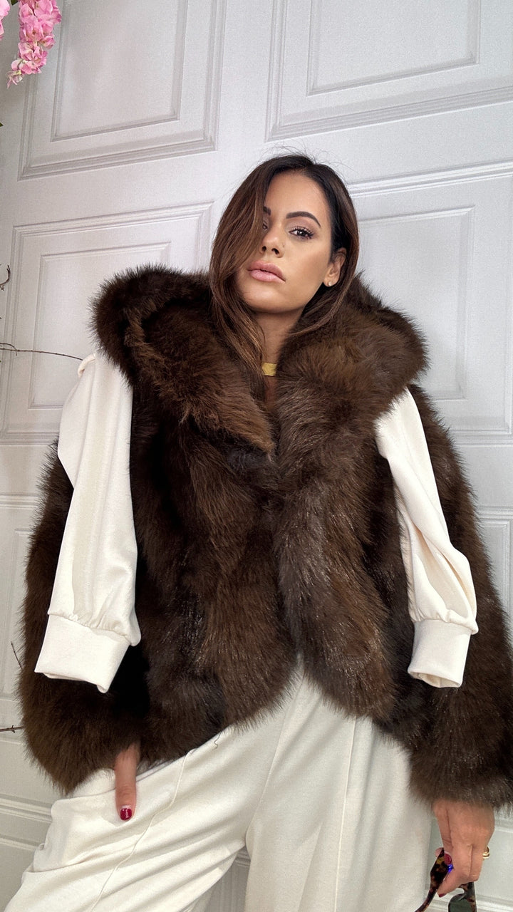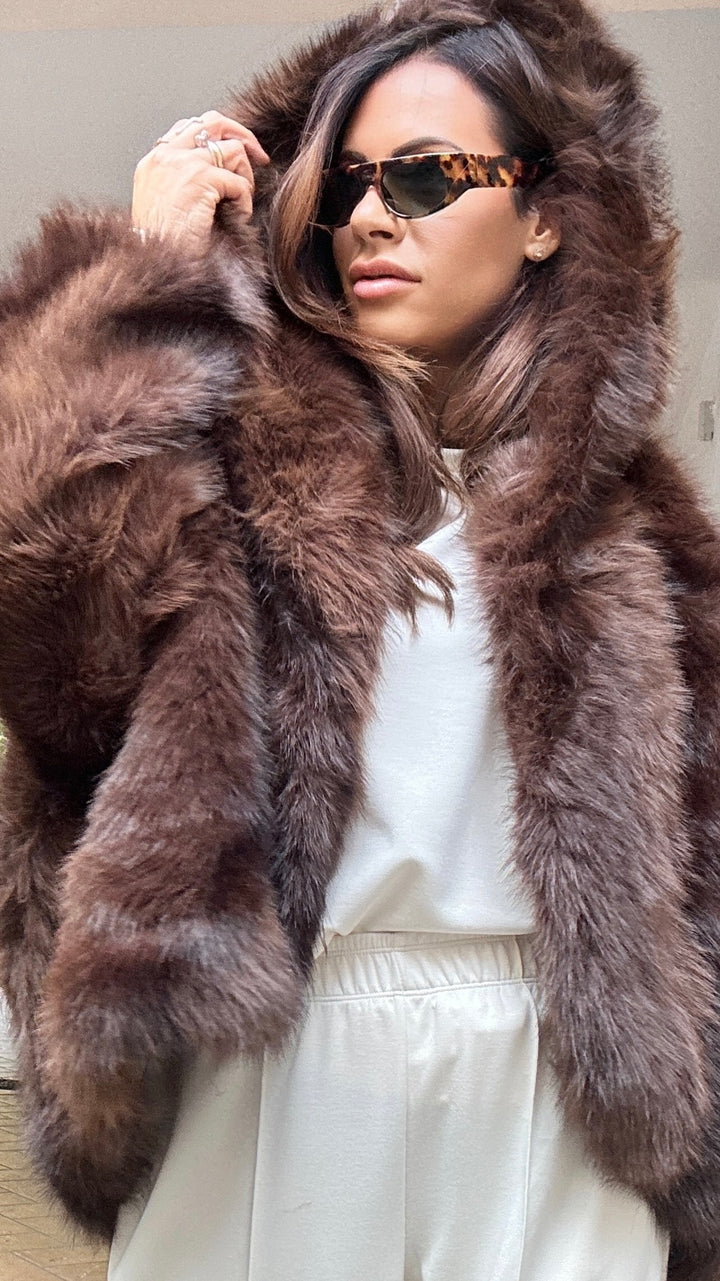 Eco pelliccia taglia unica modello over con cappuccio,corta avanti e piùunga dietro comoda calda e molto reversibile pietà la ciappetta centrale come chiusura