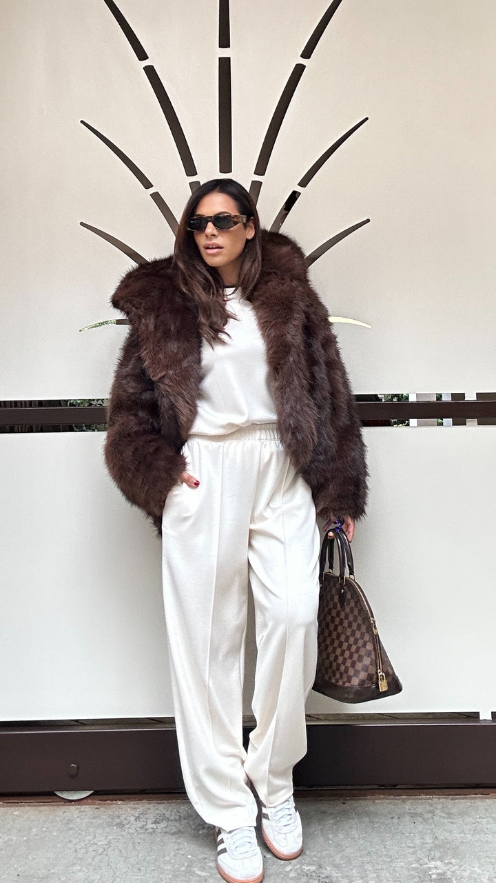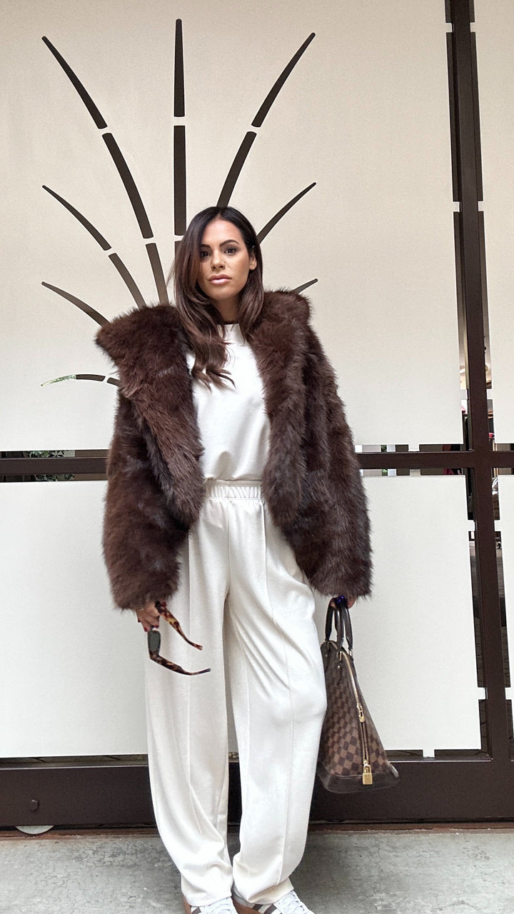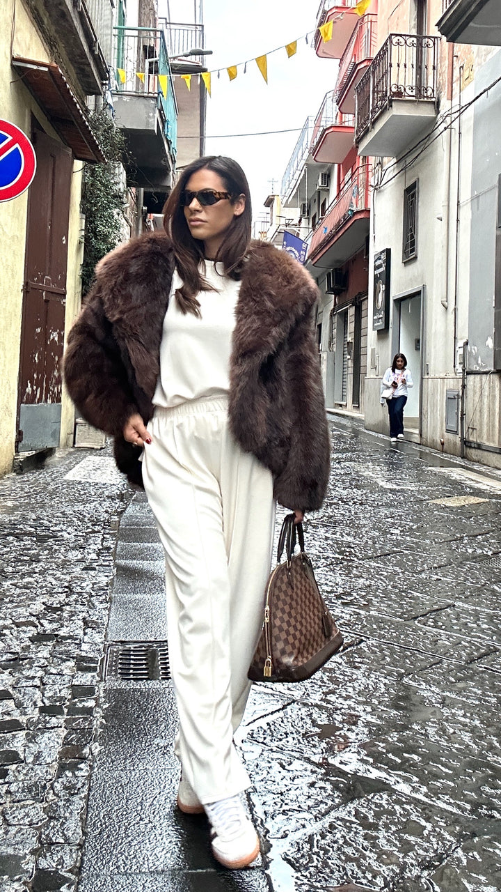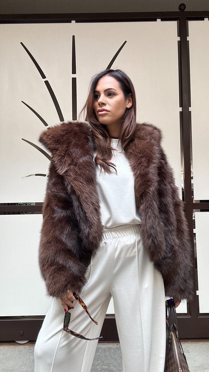 Eco pelliccia taglia unica modello over con cappuccio,corta avanti e piùunga dietro comoda calda e molto reversibile pietà la ciappetta centrale come chiusura