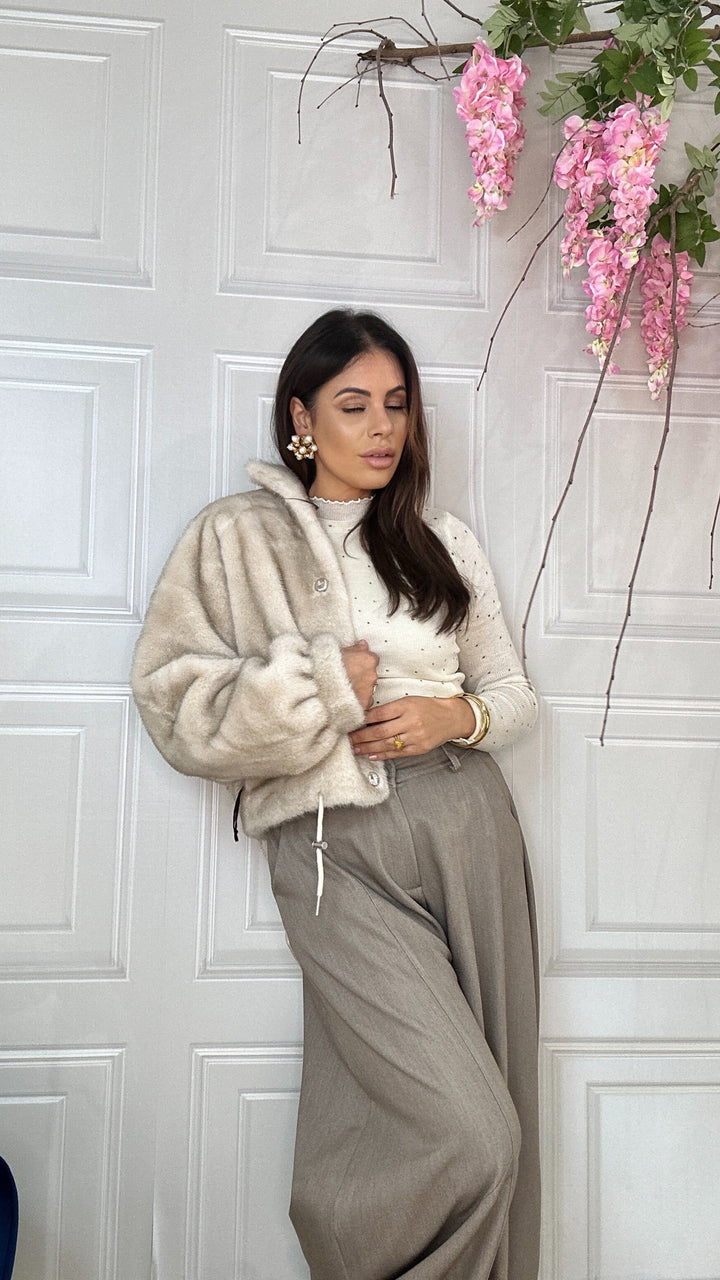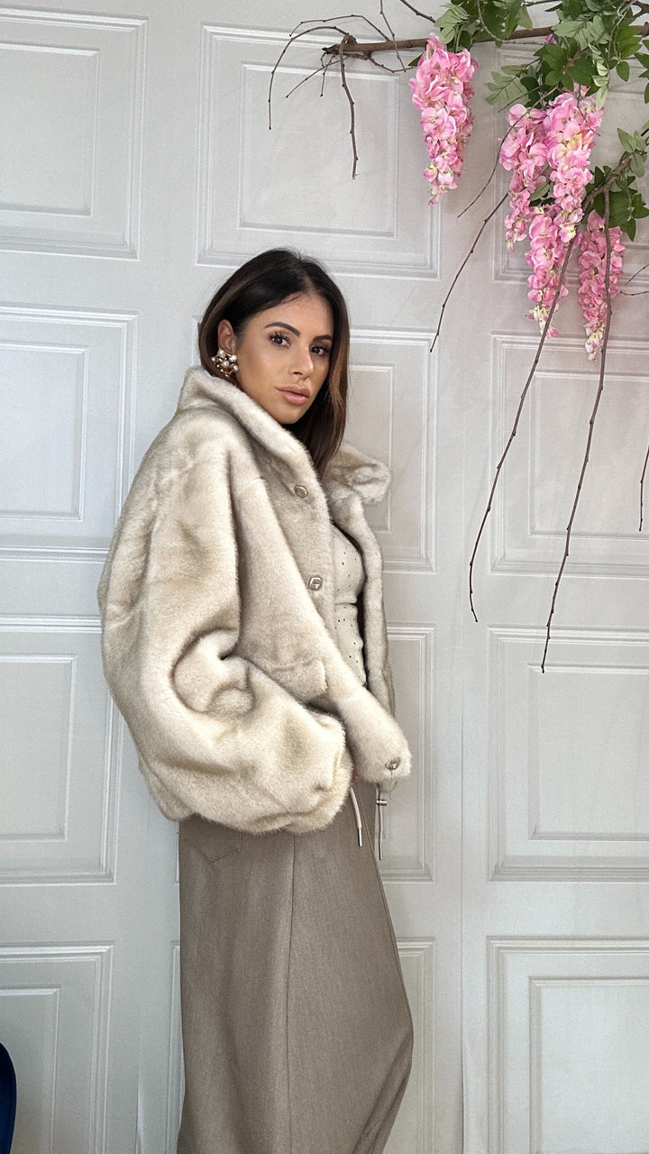 Pelliccetta in eco pelliccia modello bomberino con collo a pistagna e bottoni sul davanti porta le coulisse sui fianchi ed elastico ai polsini tasche finte sui fianchi