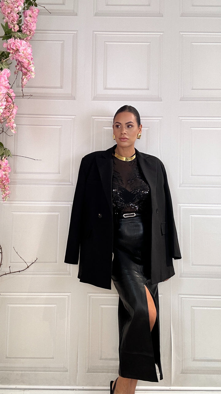 Giacca modello over con chiusura a quattro bottoni e finte tasche sul davanti e una tg unica ma veste over