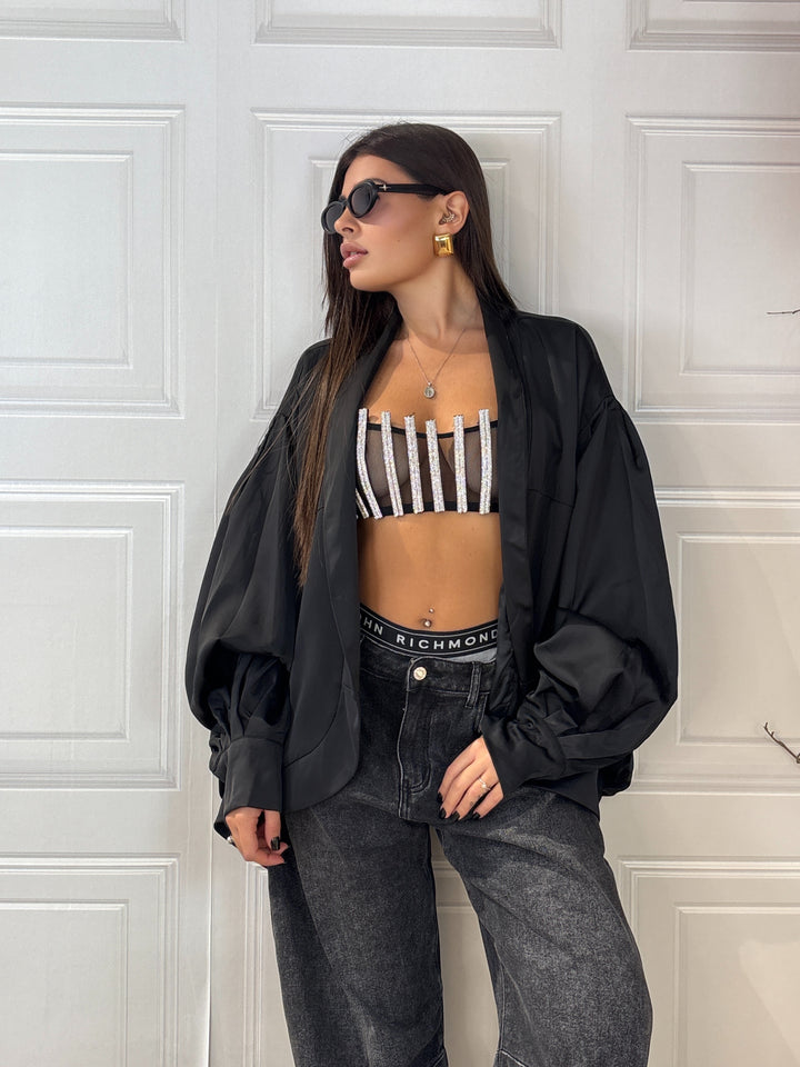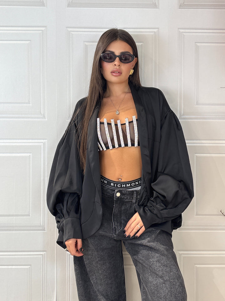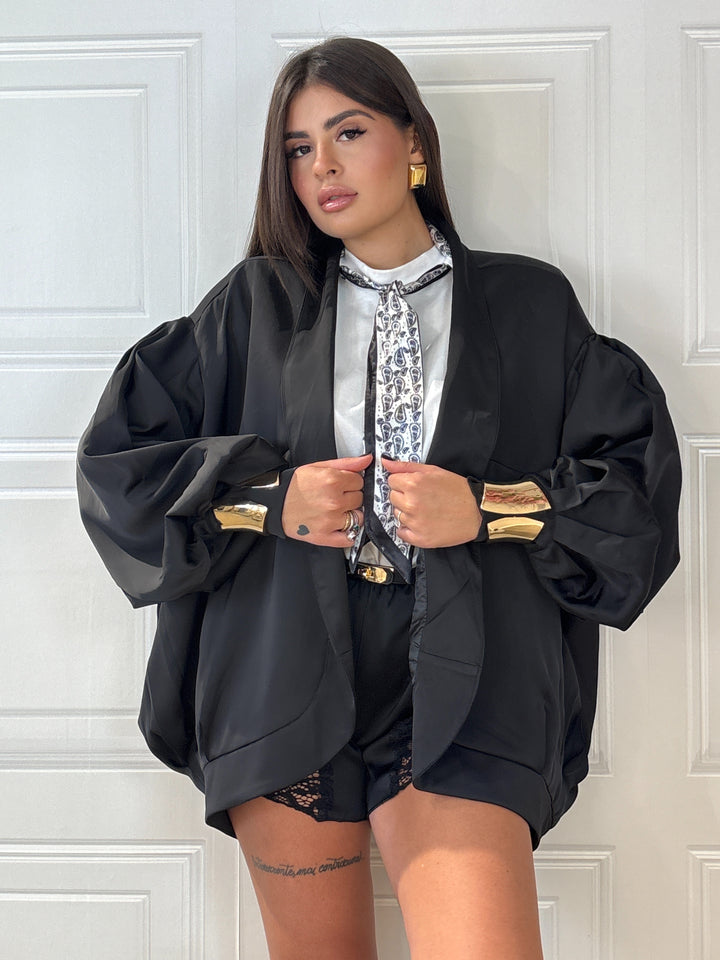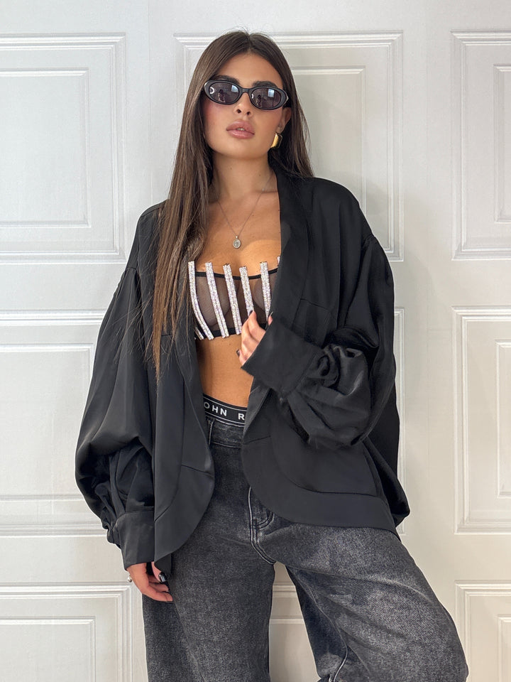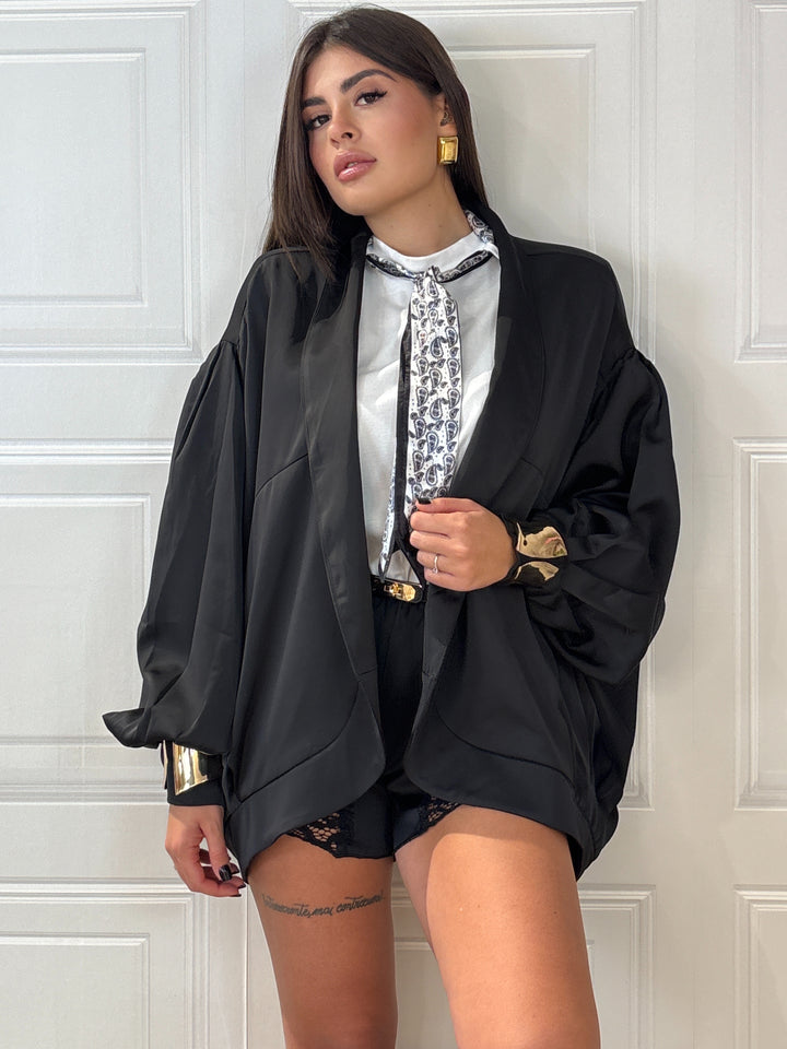 Giacca modello over effetto raso foderato all'interno dello stesso colore nn porta chiusura il tessuto e poliestere,manica a palloncino e polsino strutturato