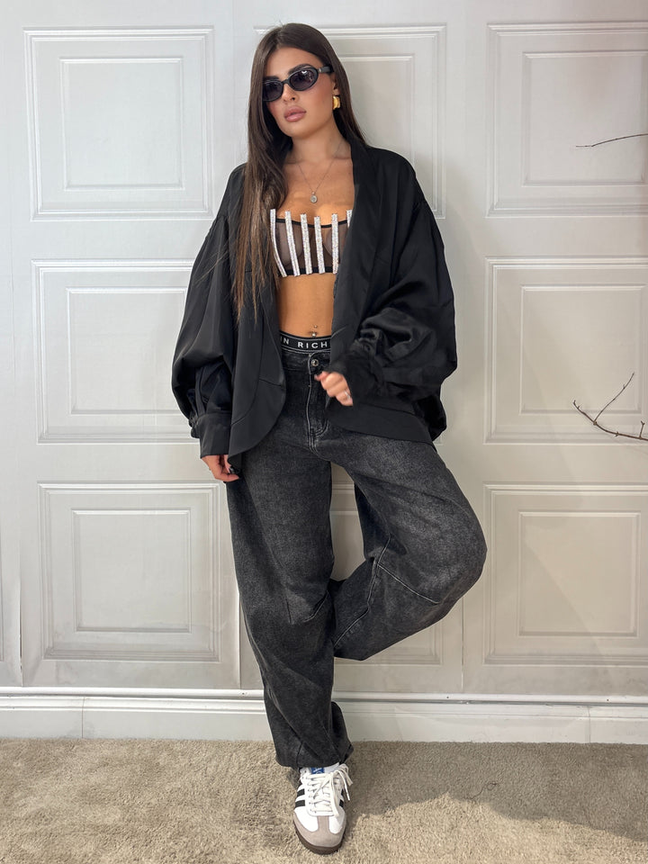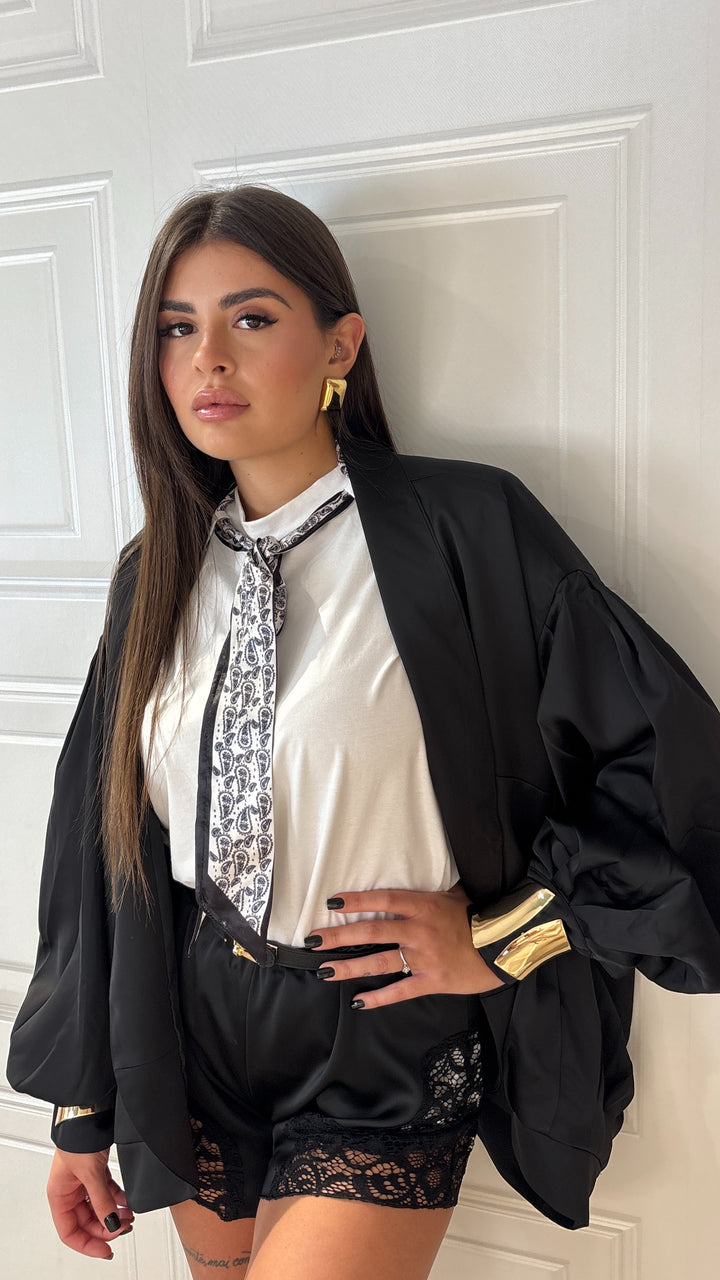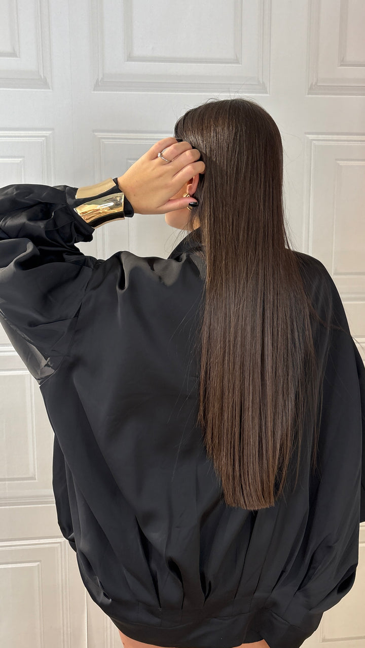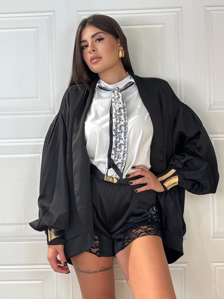 Giacca modello over effetto raso foderato all'interno dello stesso colore nn porta chiusura il tessuto e poliestere,manica a palloncino e polsino strutturato