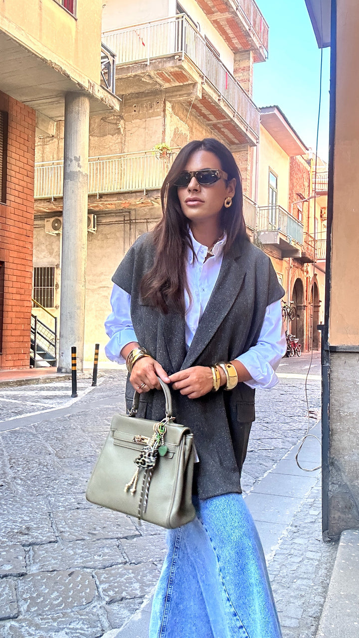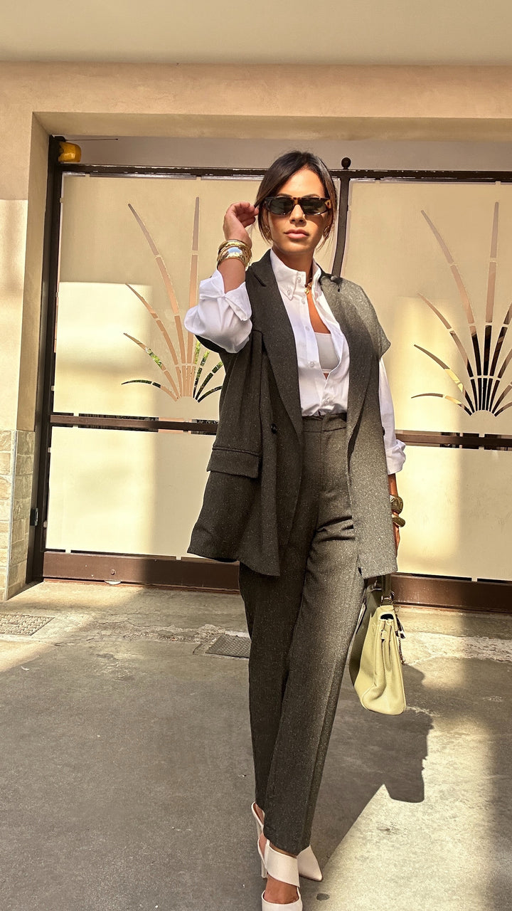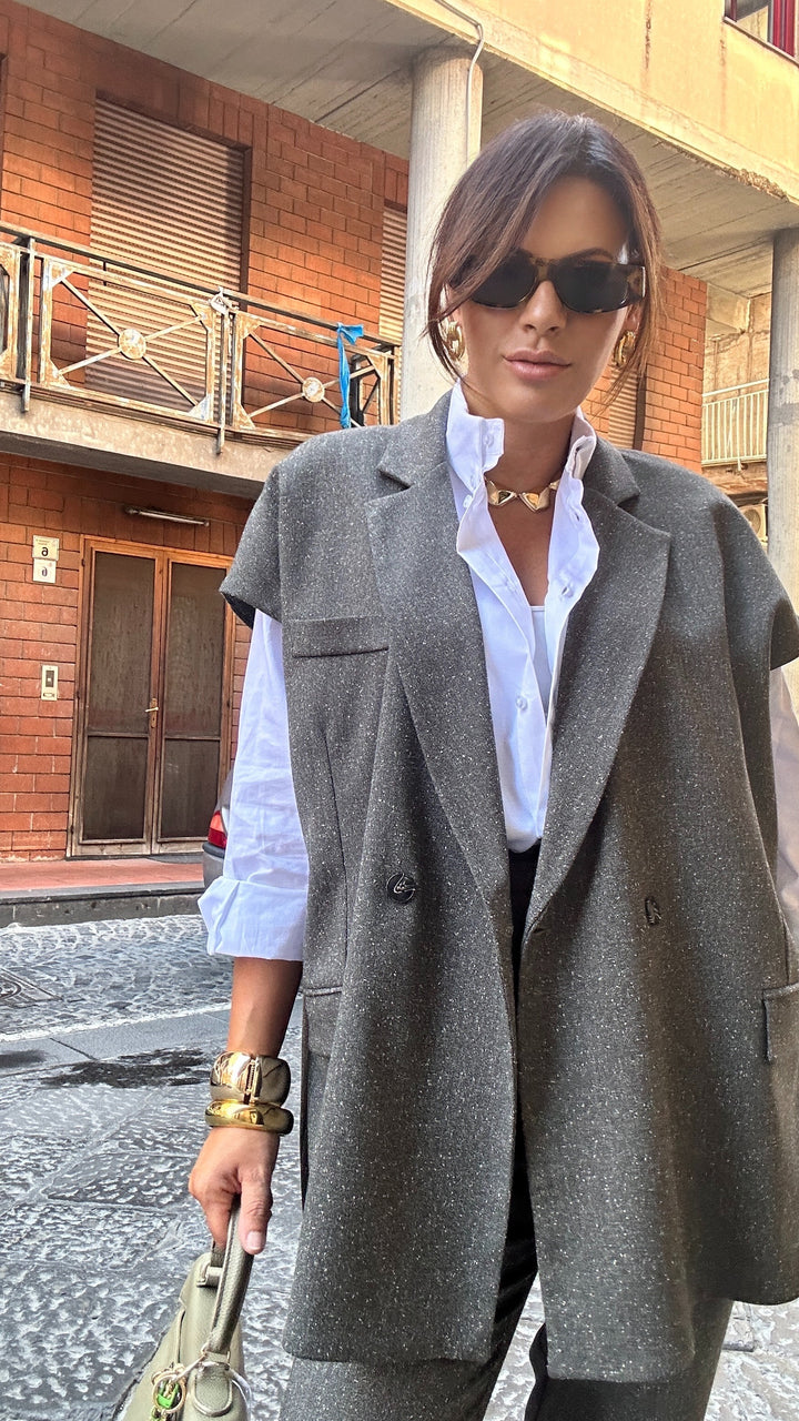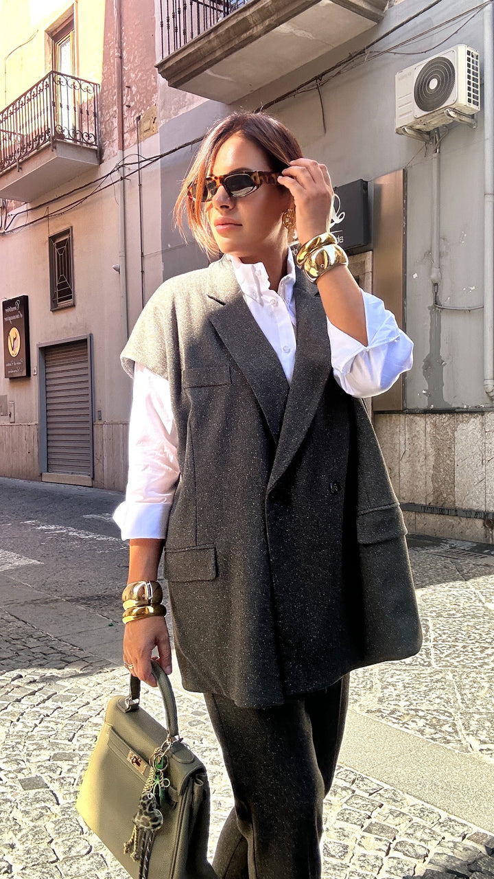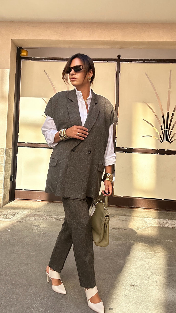 Abbinato a una camicia bianca e pantaloni coordinati, il gilet crea un look armonioso e versatile, perfetto per diverse occasioni, da eventi formali a incontri casual. L'outfit è completato con accessori come una borsa elegante e occhiali da sole, che aggiungono un ulteriore elemento di stile.